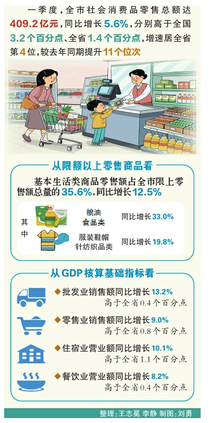 4月20日,记者从市商务局获悉,一季度,全市实现社会消费品零售总额409.2亿元,同比增长5.6%,分别高于全国3.2个百分点、全省1.4个百分点,增速居全省第4位,为全年消费市场持续向好奠定坚实基础。“分行业来看,批发、零售、餐饮等领域协同发力、稳中有进,成为拉动消费增长的主力军,彰显我市消费市场的强劲韧性与活力。”市商务局党组成员孟繁云说。