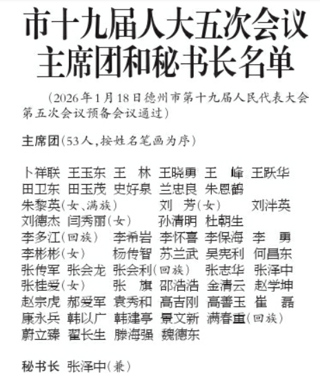 德州市十九届人大五次会议主席团和秘书长名单