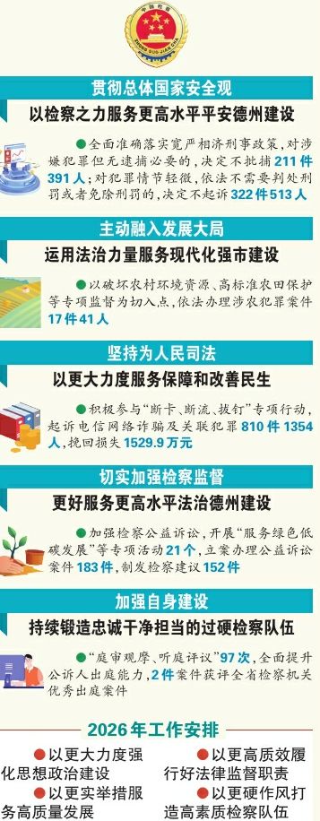 贯彻总体国家安全观,以检察之力服务更高水平平安德州建设。依法惩治犯罪,批准逮捕各类犯罪嫌疑人1345人、提起公诉4349人。依法规范适用认罪认罚从宽制度,4282名犯罪嫌疑人在检察环节认罪认罚,一审服判率98.56%。化解矛盾纠纷,扎实开展“化解矛盾风险维护社会稳定”专项治理。推进社会治理,积极参与综治中心规范化建设,两级检察院派驻全覆盖,参与研判会商61次,化解矛盾纠纷183件。