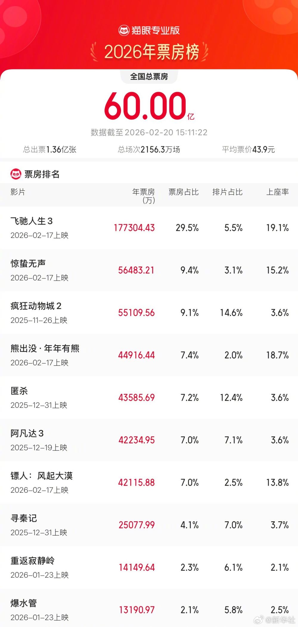 据网络平台数据,截至2月20日15时07分,2026年年度电影总票房(含预售)突破60亿!截至目前,春节档电影总票房(含预售)已突破34亿元。其中,《飞驰人生3》《惊蛰无声》《熊出没·年年有熊》位列前三。
