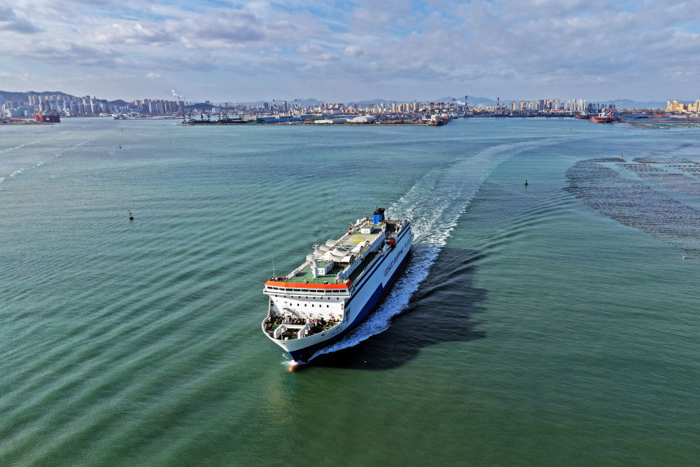 2025年12月8日,一艘客滚船驶离山东港口烟台港(无人机照片)。新华社发(孙文潭摄)