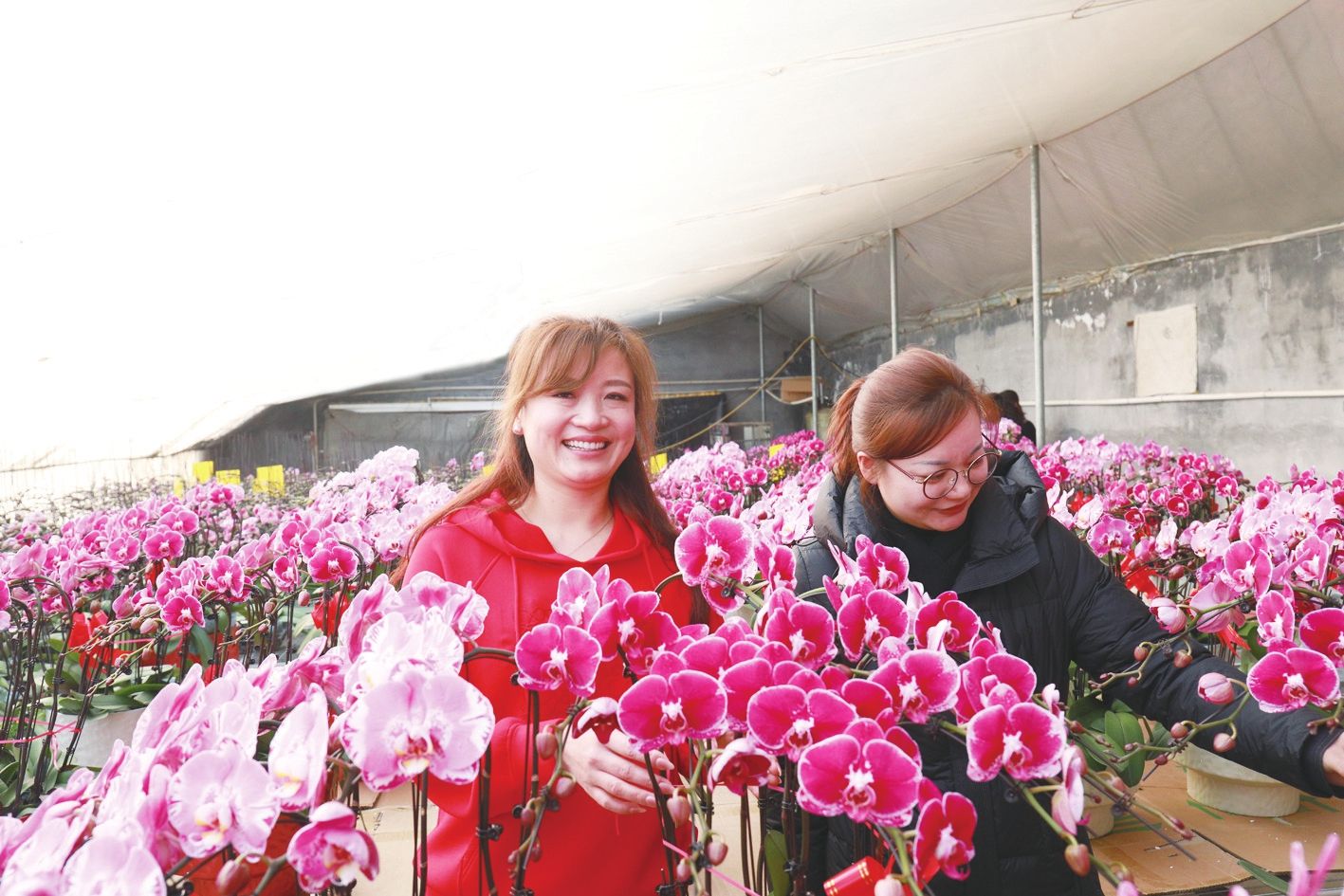 1月24日,在平原县前曹镇簸箕张村的蝴蝶兰种植基地,济南、临邑等地的客户正在棚内挑选蝴蝶兰。春节临近,年宵花销售进入旺季。该基地种植“大辣椒”“恭喜发财”等20多个品种的蝴蝶兰约3万余棵。据基地经理田殿伦介绍,目前基地预订量超五成,每天都有大量蝴蝶兰发往周边县市区,预计收入80万元左右。