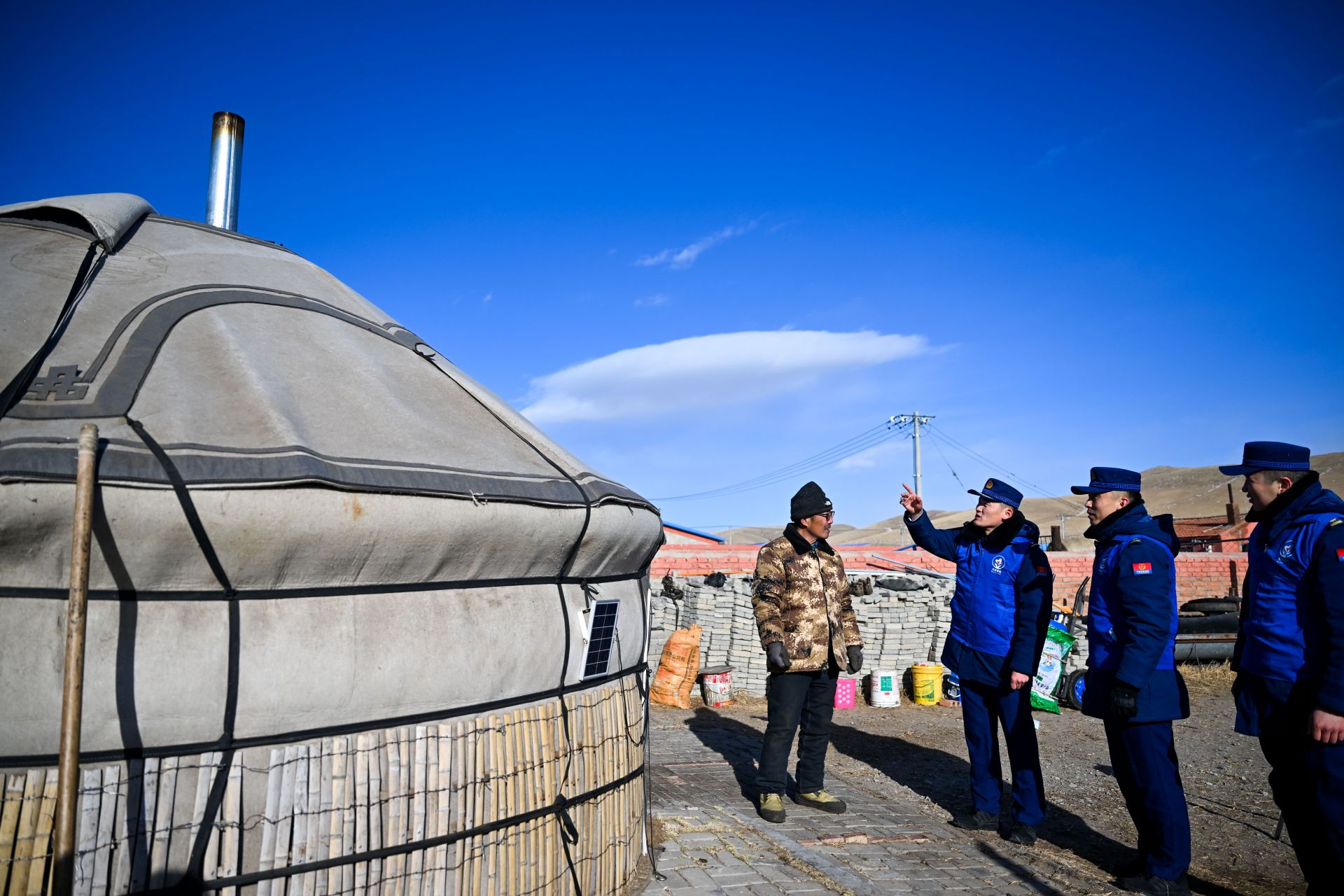 3月18日,西乌珠穆沁旗消防救援大队消防指战员在牧民吉日嘎拉家排查火灾隐患。