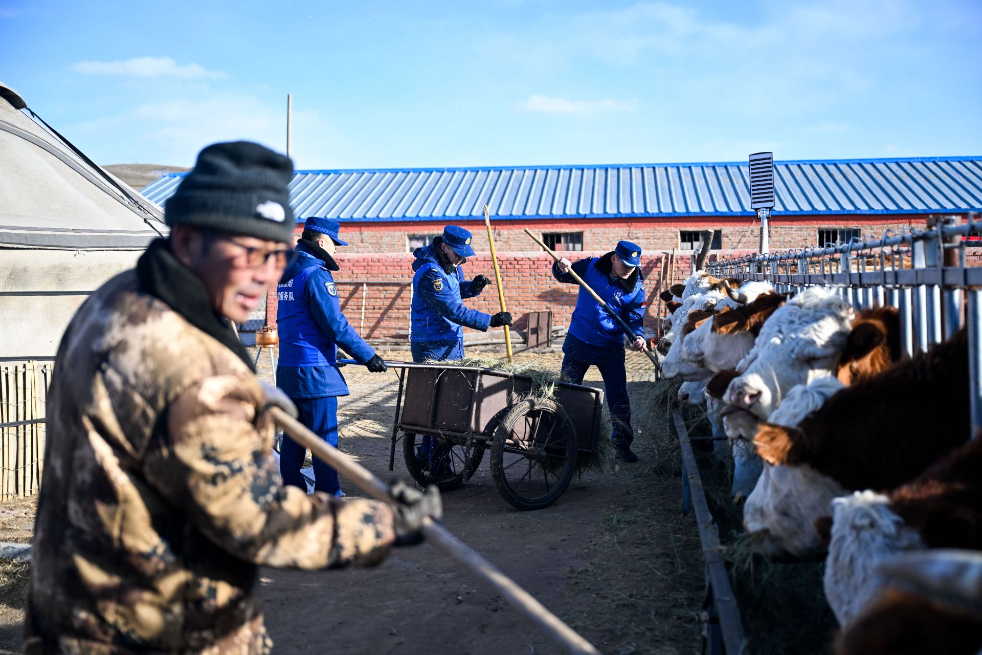 3月18日,西乌珠穆沁旗消防救援大队消防指战员帮助牧民吉日嘎拉(左)给牛喂草料。