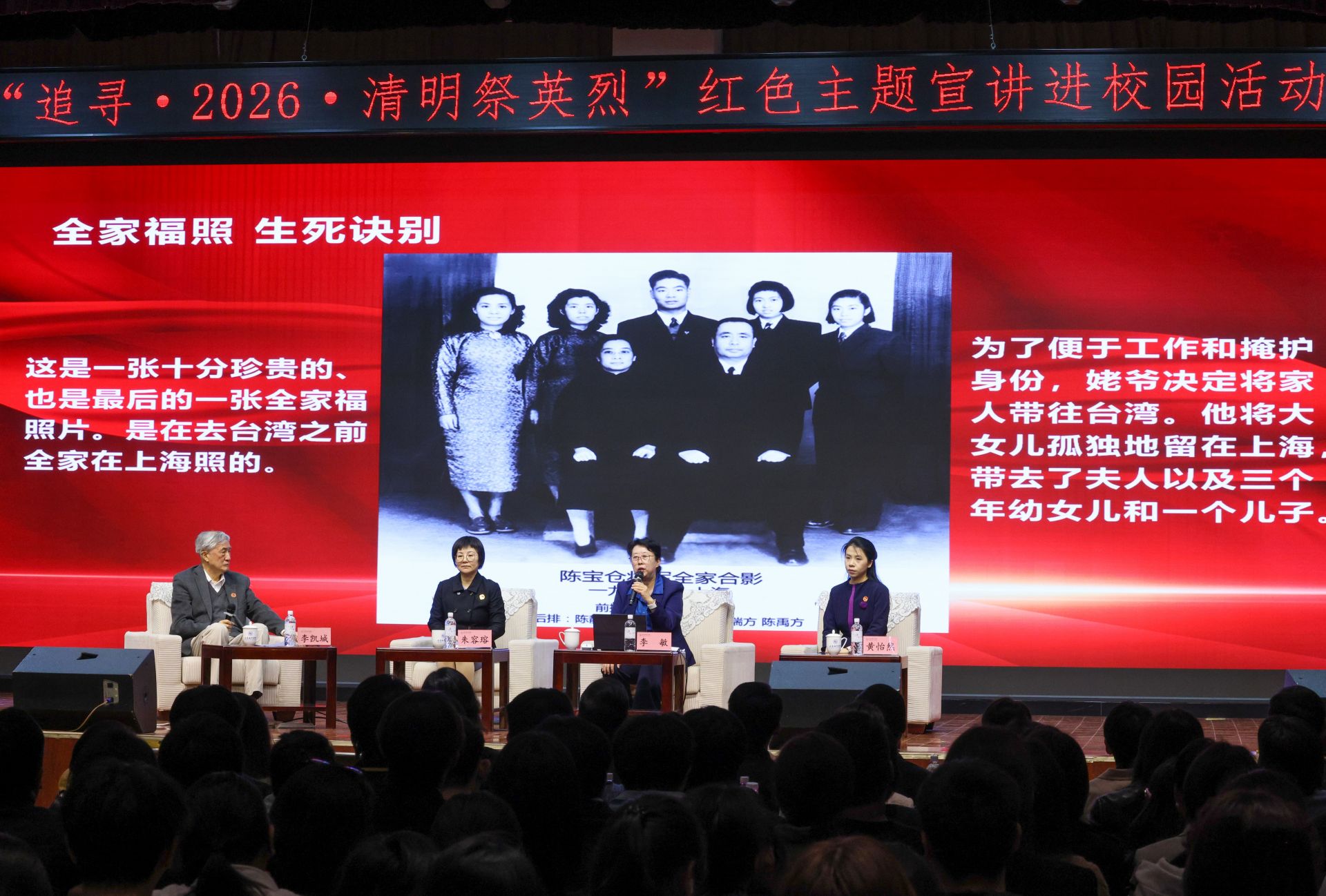 4月1日,李克农之孙李凯城(左一)、朱枫烈士孙女朱容瑢(左二)、陈宝仓烈士外孙女李敏(左三)、聂曦烈士侄孙女黄怡然参加红色主题宣讲进校园活动。