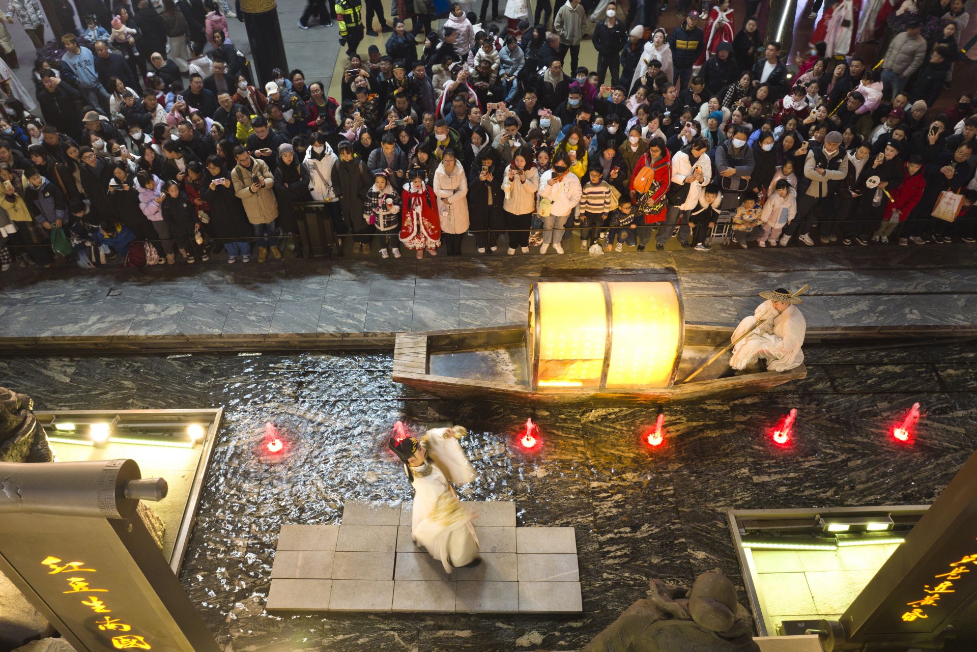 游客在西安大唐不夜城街区观看以诗人李白为原型创作的情景剧(无人机照片,2025年1月22日摄)。