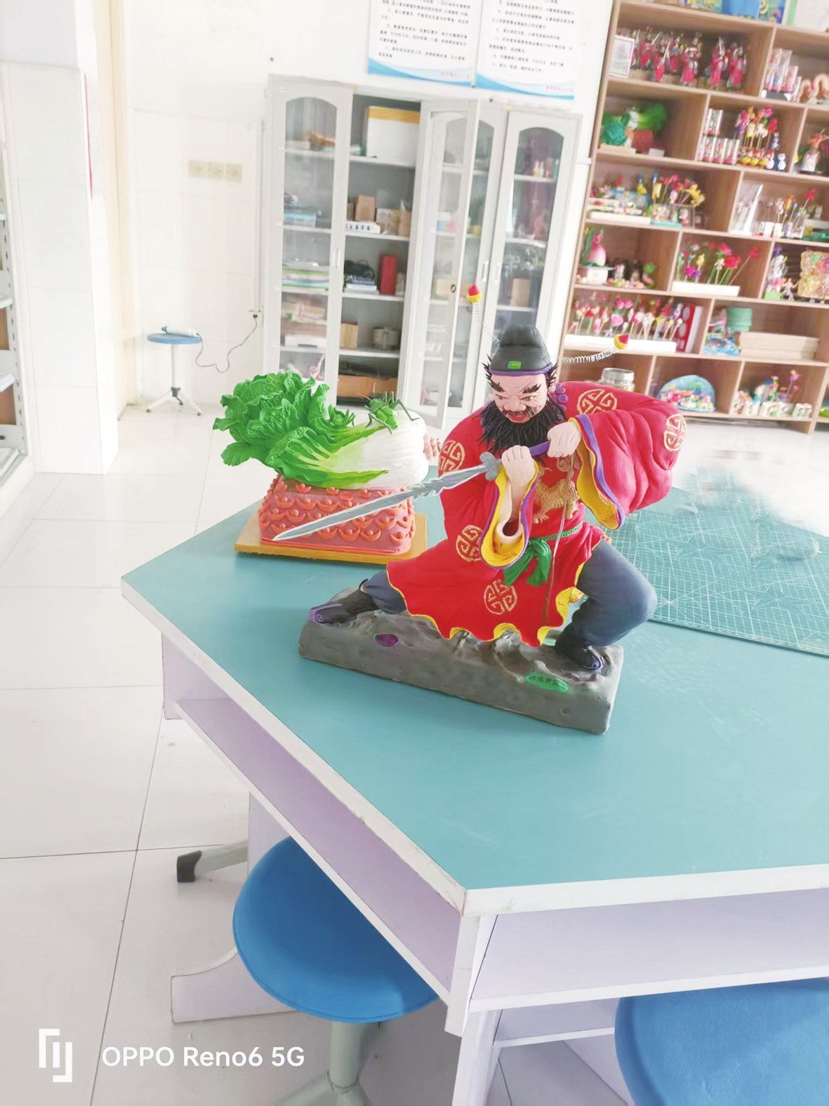 为了让面塑技艺更贴合教学需求,王向东在材料和工具上不断探索。最初,他按照书中的配方,以1:3的比例混合糯米粉和小麦粉,蒸熟后加入蜂蜜、盐、甘油和食用防腐剂,再调配成红、黄、蓝、绿、黑、白等颜色。后来,他尝试使用超轻黏土,2018年又引入了树脂黏土。“不同材料适合不同层次的教学,超轻黏土适合低年级学生入门,小麦粉面团贴近传统,树脂黏土则适合创作精品。”为了研发新材料技法,他利用寒暑假奔赴北京、杭州等地的学校交流学习。