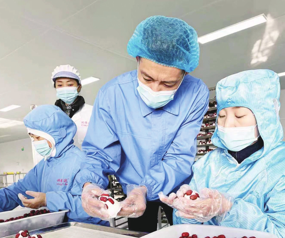 刘超(左)指导员工制作红枣年糕