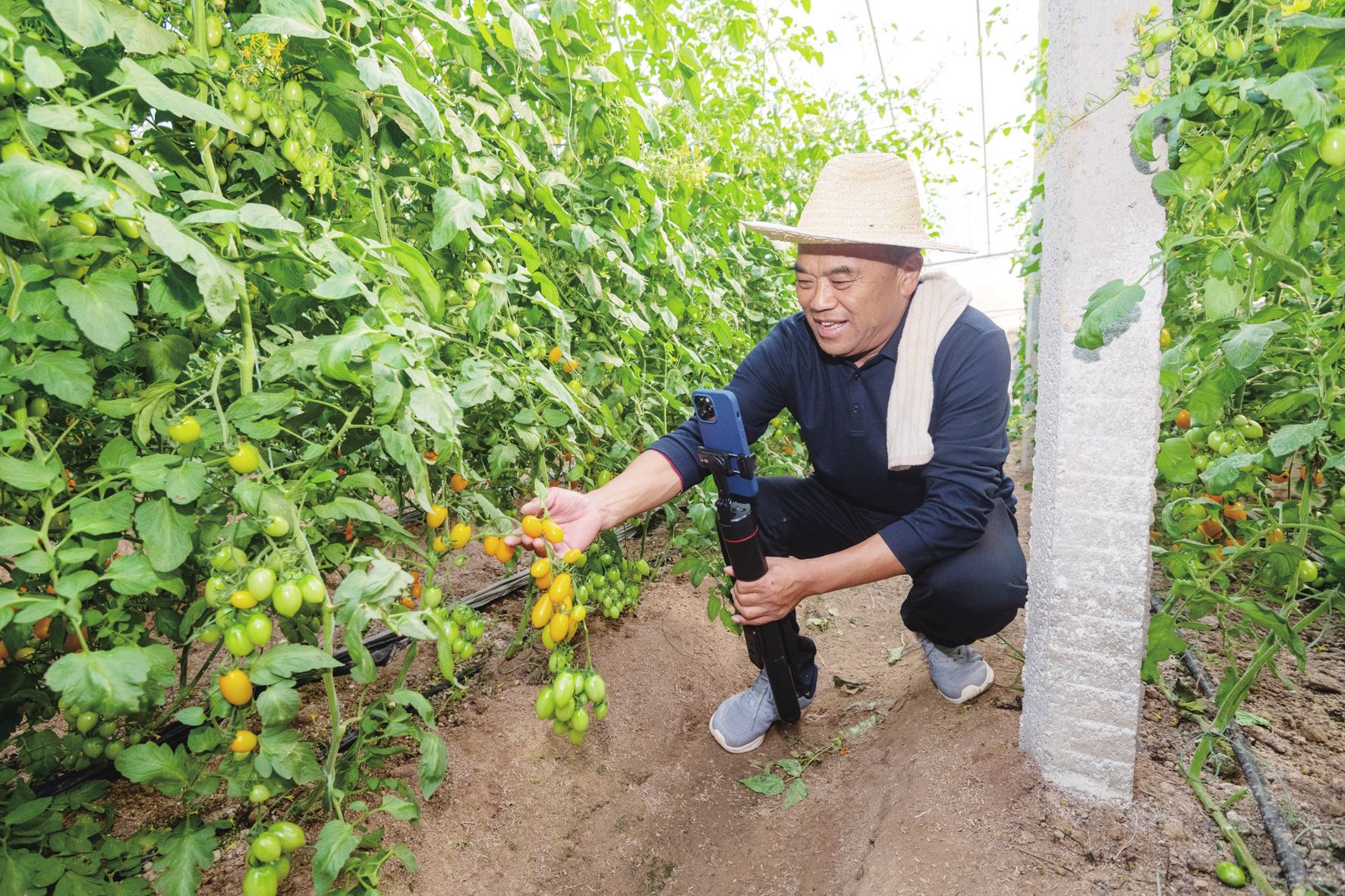 采访接近尾声,姜洪涛的手机响了,是大棚那边打来的,说明天的西红柿该定价了。他应着,站起来,那条白毛巾还搭在肩上。