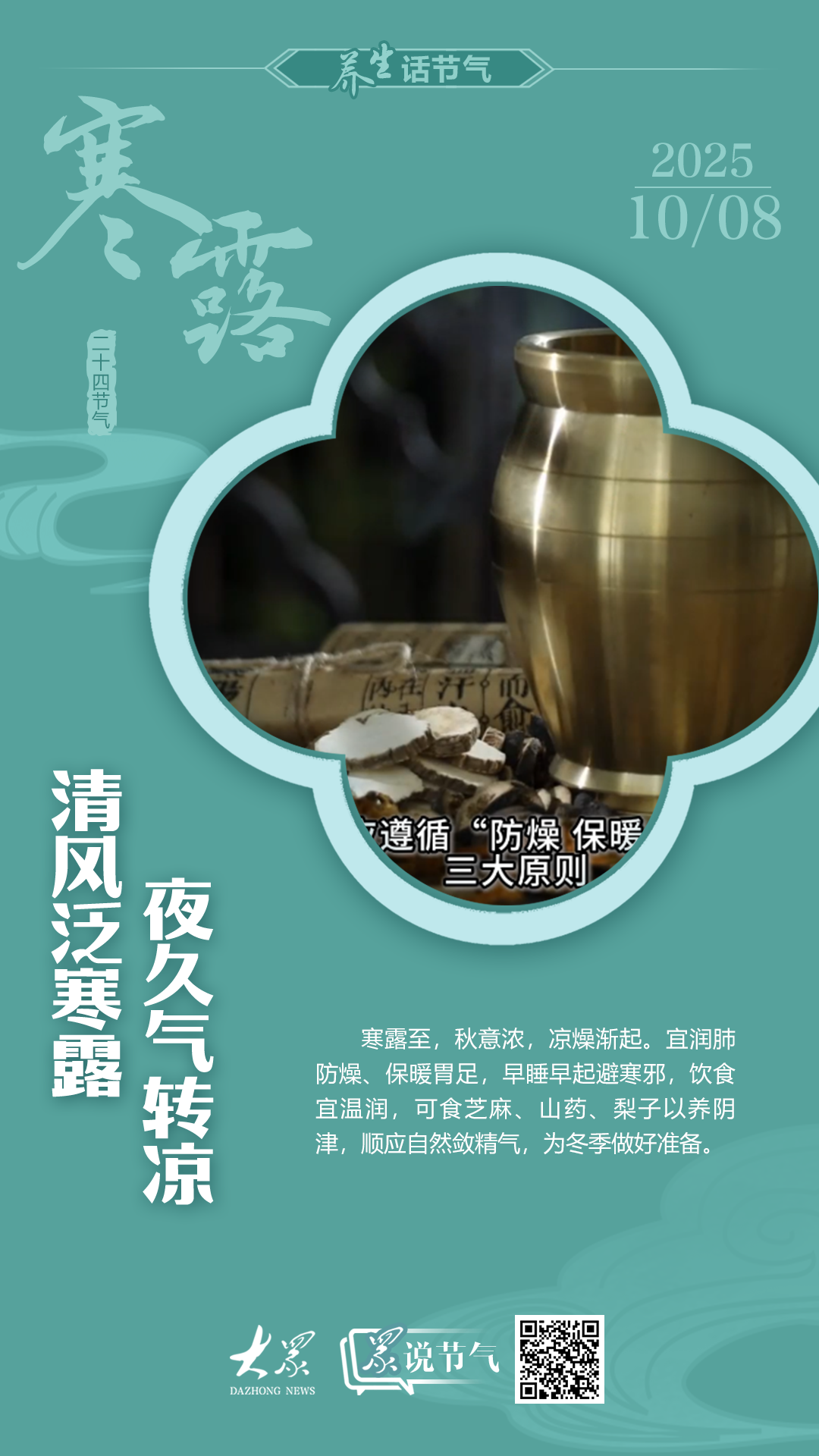 一句话概括:寒露至,秋意浓,凉燥渐起。宜润肺防燥、保暖胃足,早睡早起避寒邪,饮食宜温润,可食芝麻、山药、梨子以养阴津,顺应自然敛精气,为冬季做好准备。