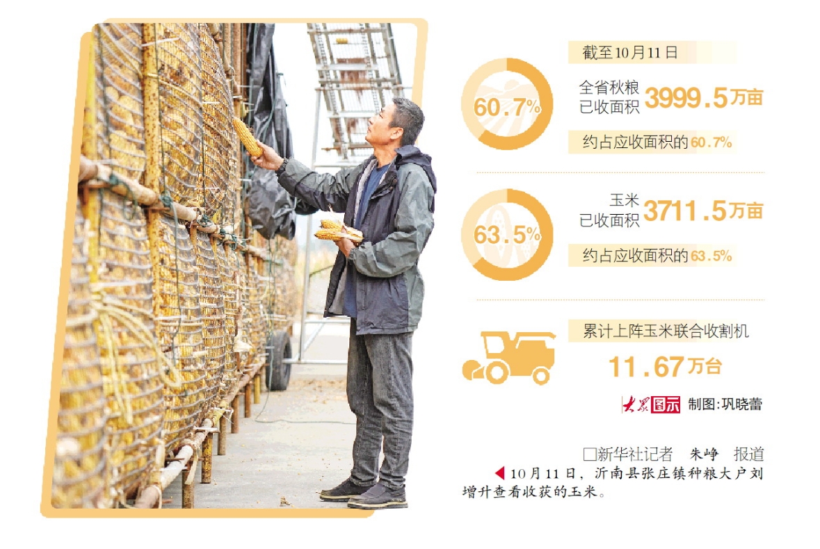 □新华社记者朱峥报道 10月11日,沂南县张庄镇种粮大户刘增升查看收获的玉米。