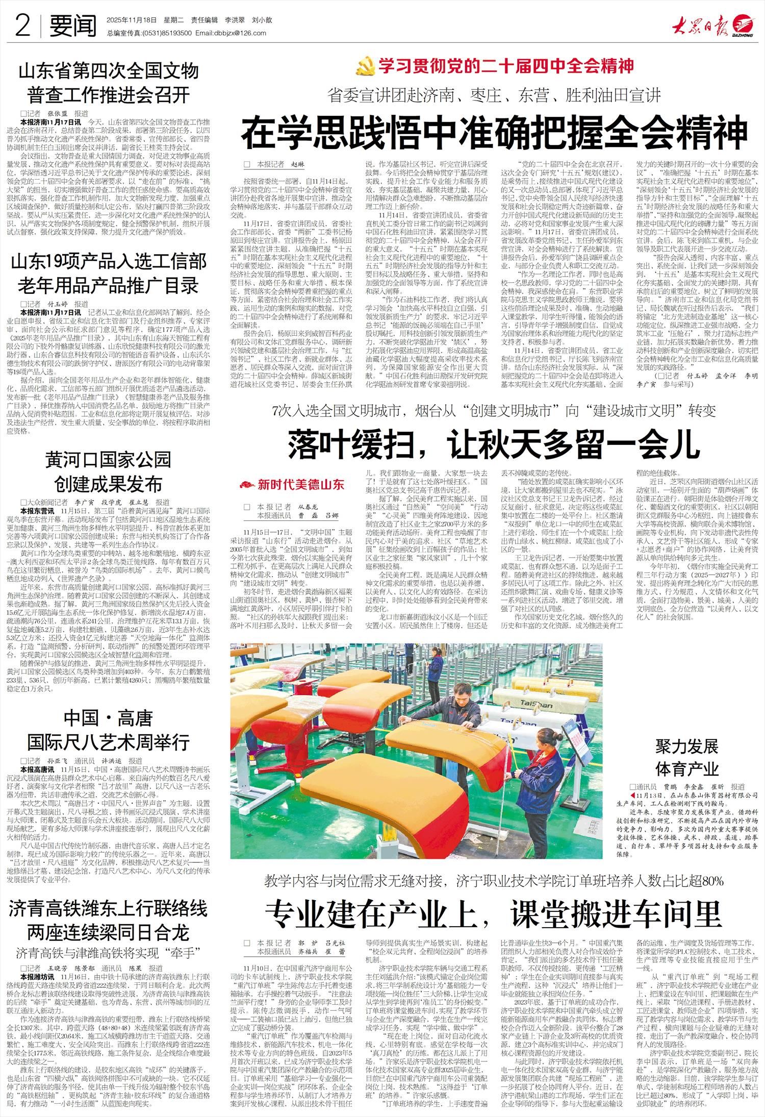 报告会后,杨原田来到威智百科药业有限公司和文体汇党群服务中心,调研新兴领域党建和基层社会治理工作,与“红领书记”、社区工作者、新就业群体、志愿者、居民群众等深入交流,面对面宣讲党的二十届四中全会精神。薛城区新城街道花城社区党委书记、居委会主任孙琪说,作为基层社区书记,听完宣讲后深受鼓舞。今后将把全会精神贯穿于基层治理实践,提升社会工作专业能力和服务质效,夯实基层基础,凝聚共建力量,用心用情解决群众急难愁盼,不断推动基层治理工作迈上新台阶。