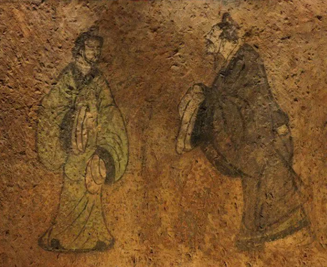 南壁壁画上层是四个男性两两对饮