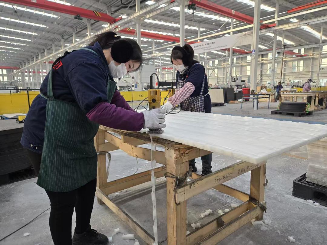 这块仿真冰板看似普通,实则藏着实打实的制造能力:它采用分子量高达900万以上的超高分子量聚乙烯复合材料,摩擦系数仅0.015,无限接近真冰顺滑度,能在-180℃至80℃的极端环境中保持稳定性能,且耐磨损、抗冲击,使用寿命达15年以上。而在2017年之前,国内仿真冰市场被国外产品垄断,一平方米仿真冰板售价高达4000元,使用寿命仅3年,国内企业几乎没有话语权。