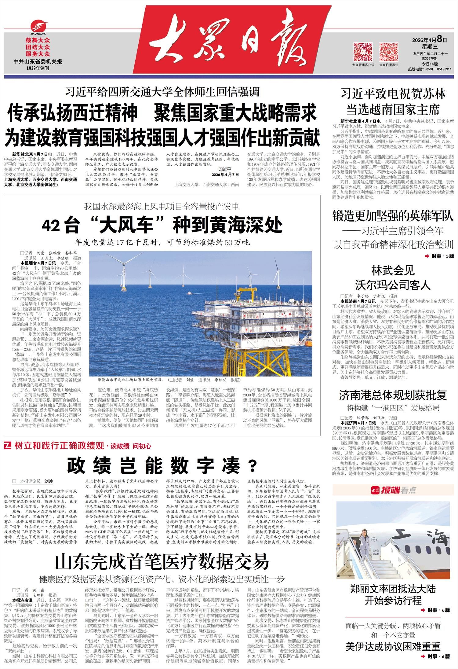 该项目年发电量达17亿千瓦时,可节约标准煤约50万吨。从山东看,到2030年,全省将推动省管海域海上风电建成规模突破1000万千瓦;放眼全国,“十五五”时期,我国海上风电累计并网装机规模预计将超1亿千瓦。