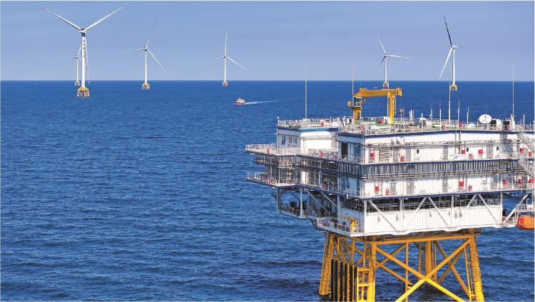 4月7日,“合闸”指令一出,距海岸约70公里处,42台“大风车”便于黄海北部广袤的深蓝海面上齐齐旋翼。