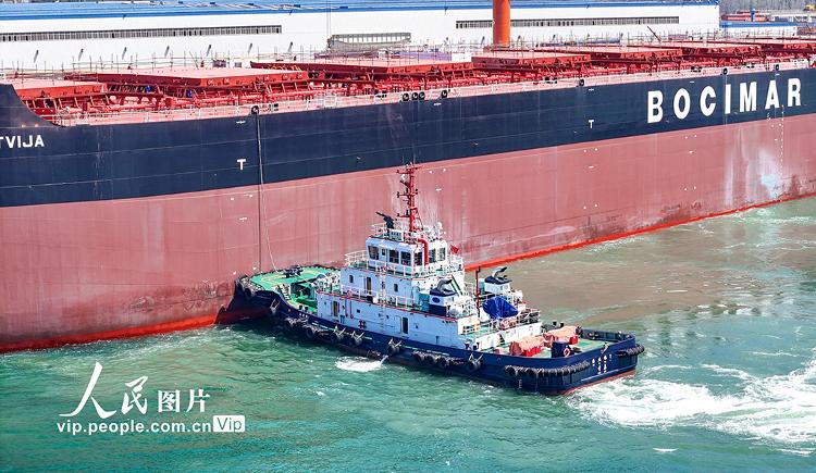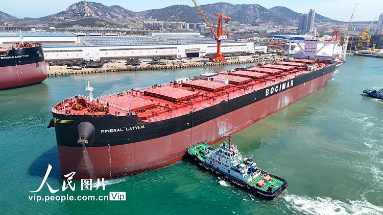2026年4月13日,中国船舶集团青岛北海造船有限公司生产现场繁忙有序。一艘21万吨级绿色燃料船舶完成手续办理,启程出海试航。据了解,该公司目前在建船舶25艘,手持订单90余艘,其中绿色燃料船舶占比超90%,部分船型交付期已排至2030年。张进刚摄(人民图片网)
