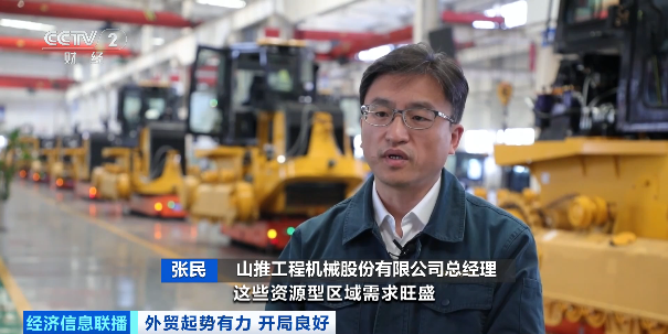 山推工程机械股份有限公司总经理 张民:像非洲、东南亚、南美洲、中亚这些资源型区域需求旺盛,我们的大马力推土机、大型矿山挖掘机以及刚性矿卡,今年都实现了销售同比翻番。