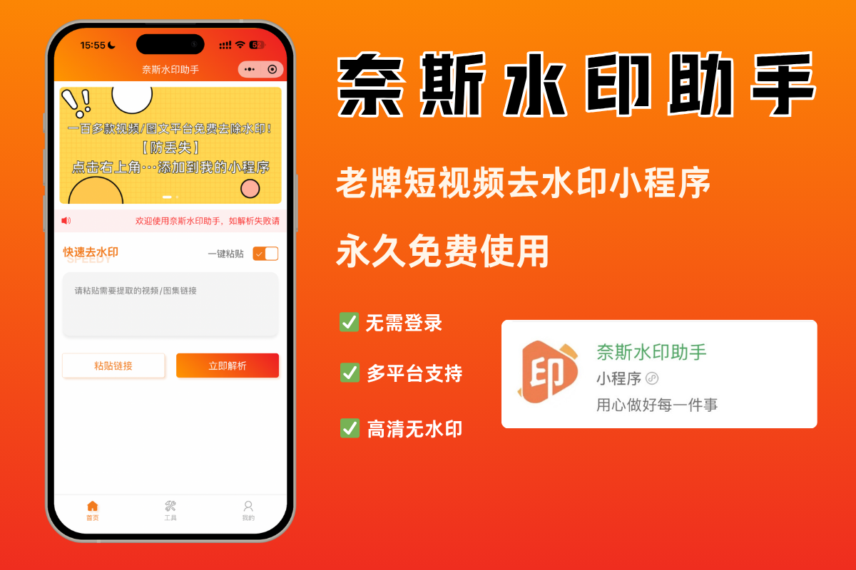 简介:奈斯水印助手同样是微信生态内的轻量级去水印工具,它真正做到了“即点即用”。无需安装App,也不用注册账号,打开就能使用。经过实测,它能够在1秒内完成去水印操作,这个速度比市面上多数工具快上数倍,效率非常高。其操作流程简单到极致,用户只需粘贴视频链接,它就会自动解析,最后一键下载即可,哪怕是新手也能迅速掌握。它的兼容性很强,不仅能兼容抖音、快手、小红书、B站等主流平台,还能解析部分小众内容社区的视频。而且,它永久免费、无限次数使用,既省心又省钱。