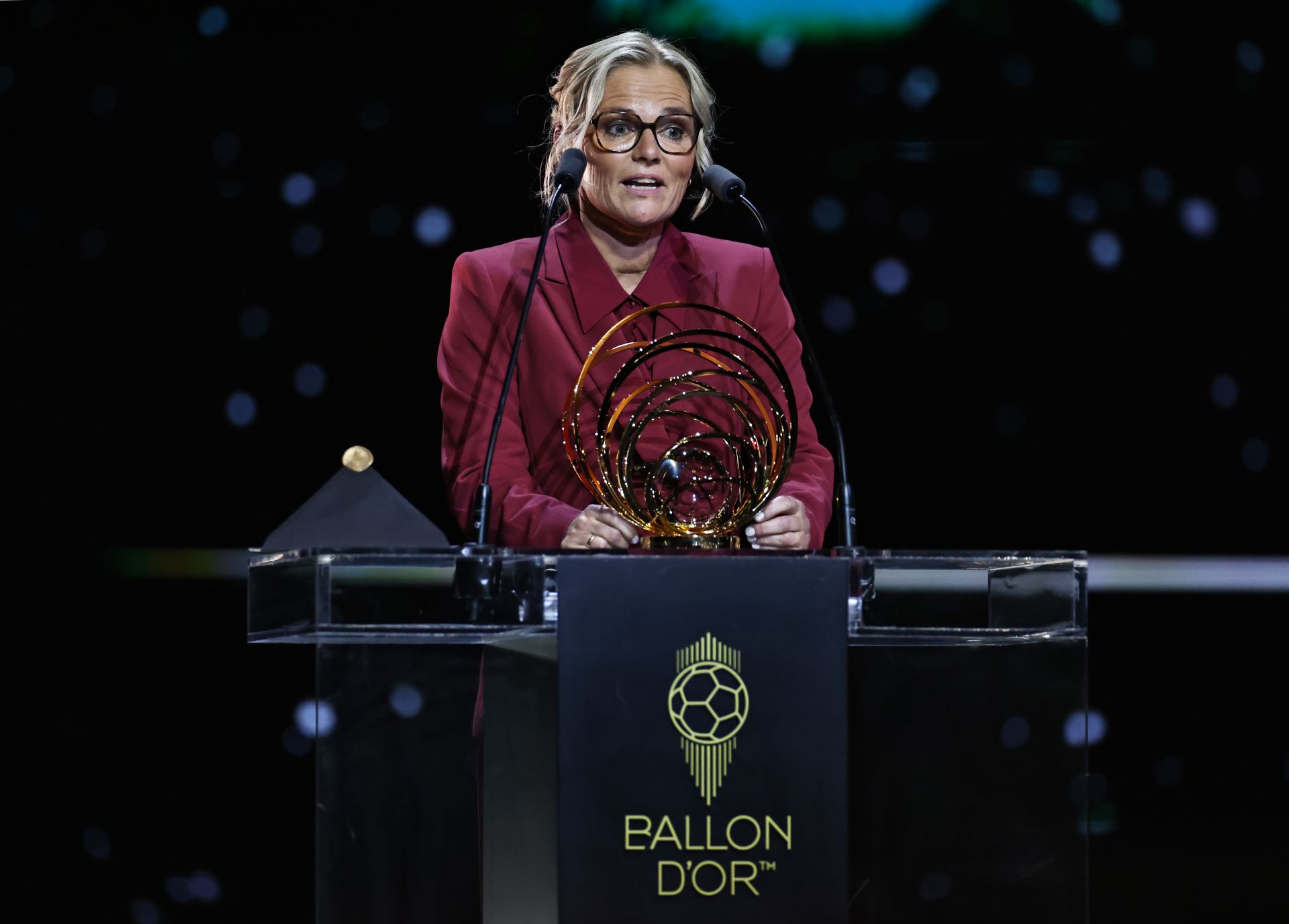 9月22日,英格兰女足荷兰籍主教练威格曼在颁奖仪式上讲话。她当选女足最佳教练。