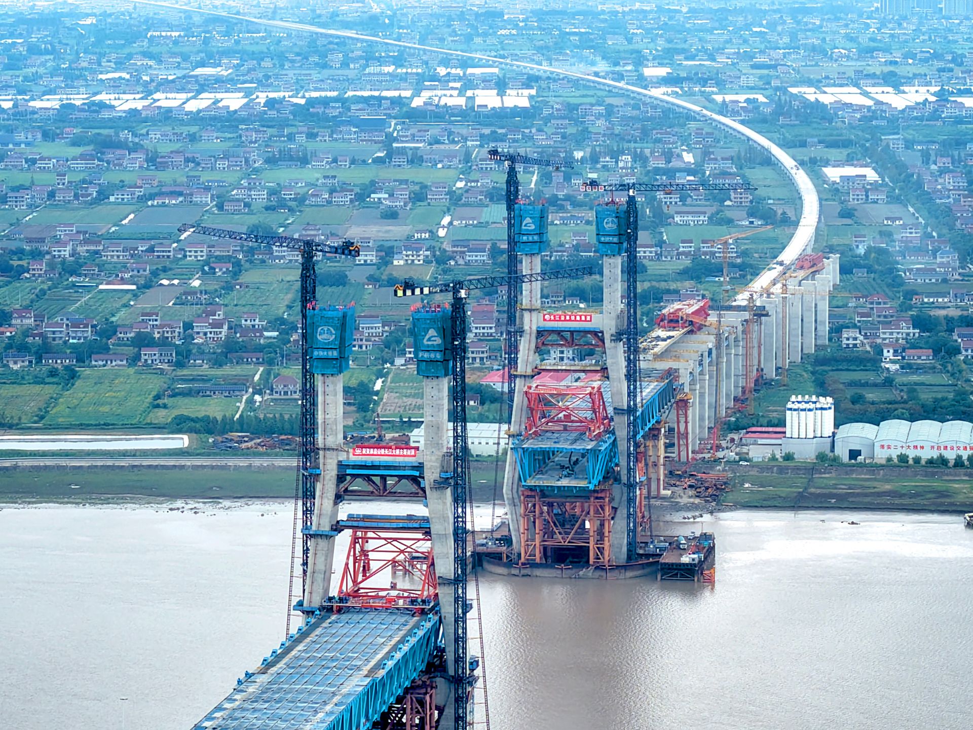 9月29日,由长江沿岸铁路集团公司建设、沪杭客专公司建设管理、中铁大桥局施工的崇启公铁长江大桥3号、4号双主塔同日封顶。