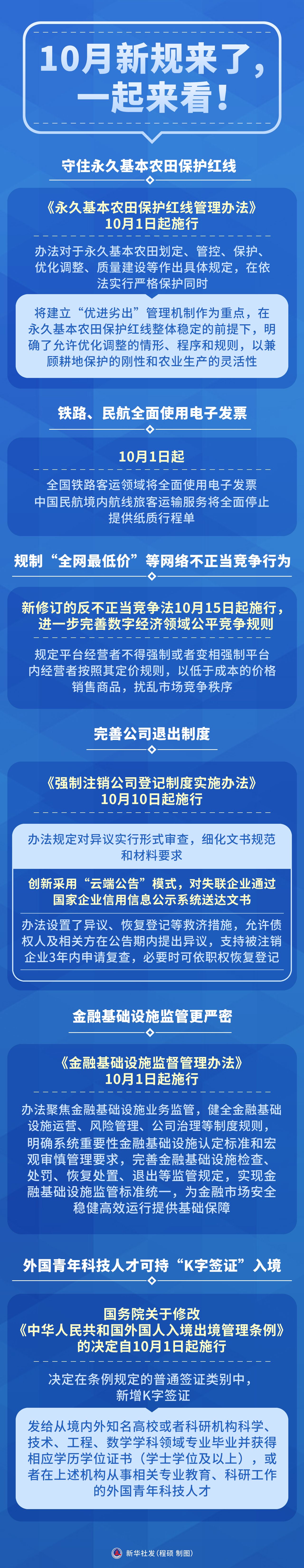 新办法守住永久基本农田保护红线;铁路、民航10月1日起全面使用电子发票;新修订的反不正当竞争法规制“全网最低价”等网络不正当竞争行为……10月新规来了,一起来看!