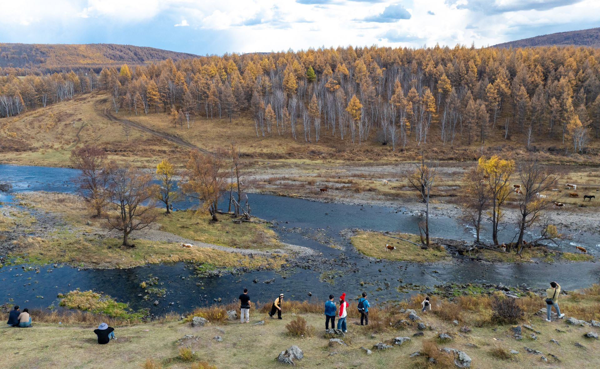 9月29日,游客在内蒙古阿尔山国家森林公园不冻河旁游玩(无人机照片)。