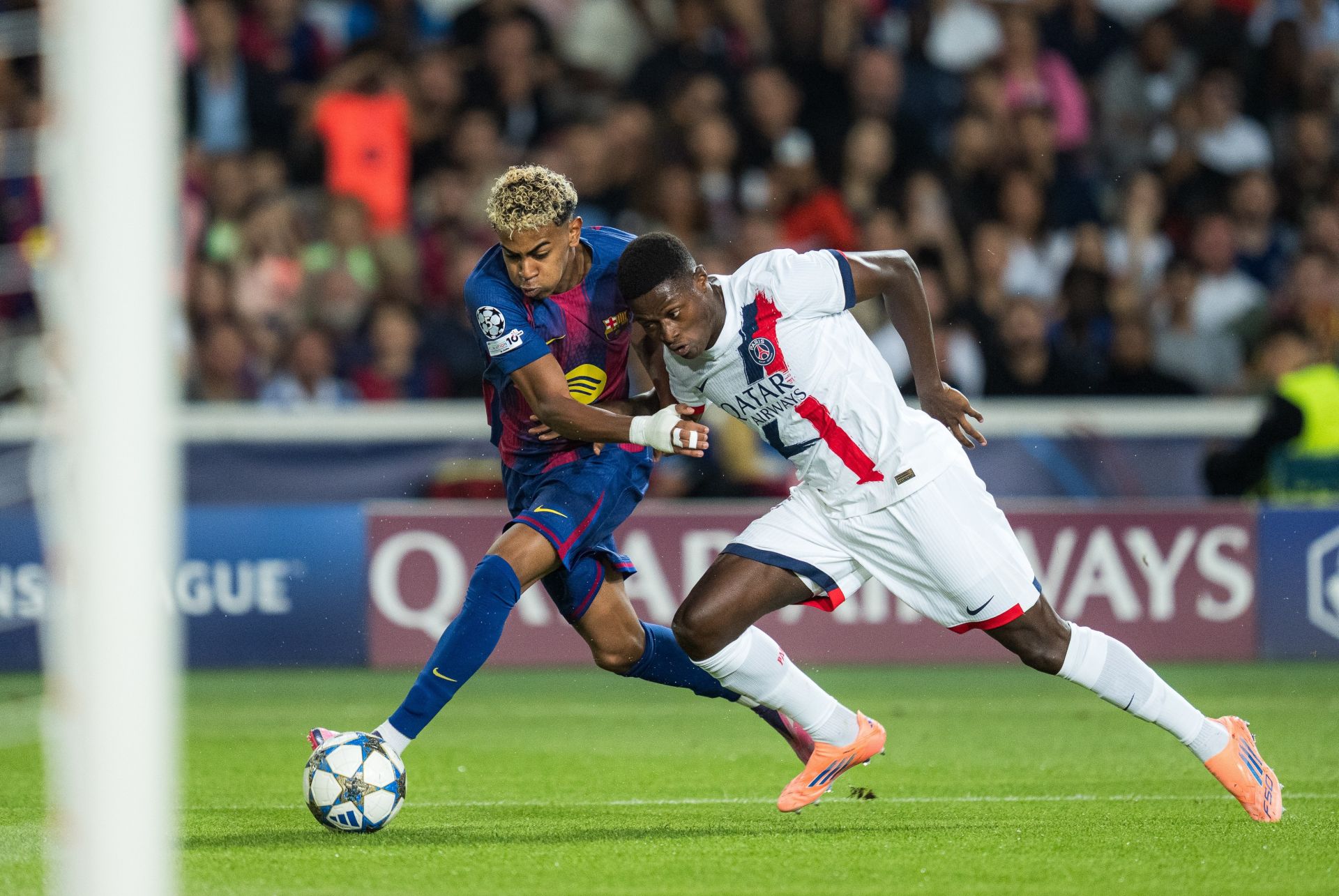 10月1日,巴塞罗那队球员亚马尔(左)和巴黎圣日尔曼队球员努诺·门德斯在比赛中拼抢。