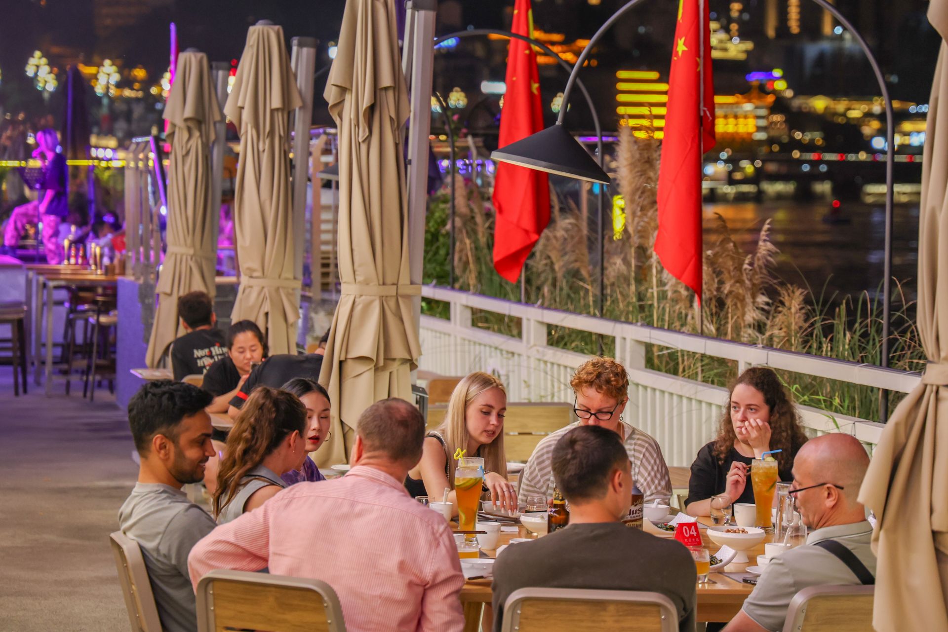 9月30日,外国游客在重庆市南岸区南滨路品尝重庆美食、欣赏夜景。