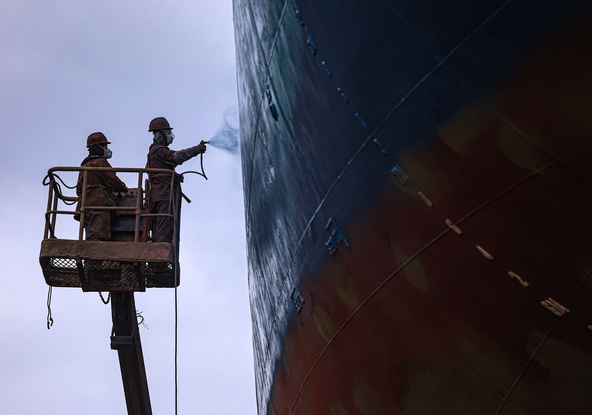 10月9日,在山东省荣成市石岛管理区港湾街道一家民营修船企业,工人们在维修船舶。