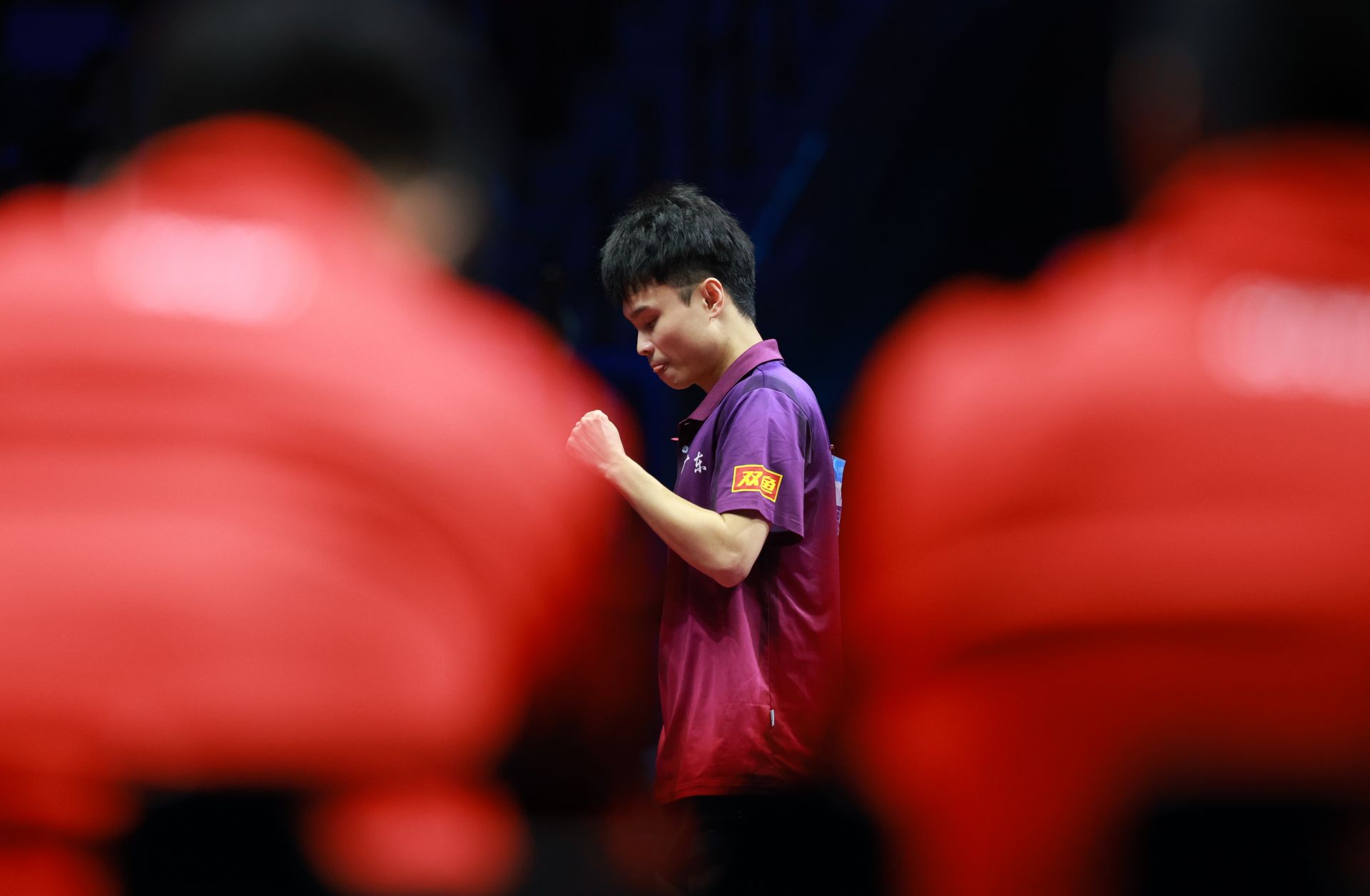 11月20日,广东队选手周启豪在比赛中庆祝得分,他3比1战胜黑龙江队选手魏世皓。