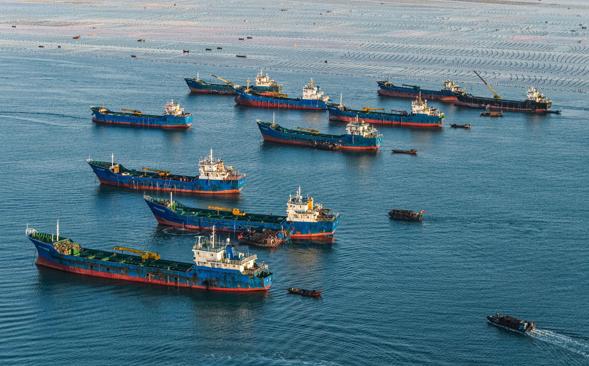 11月21日,在山东省荣成市爱伦湾海洋牧场,养殖工人将鲍鱼从海中捞出,装船发往福建(无人机照片)。