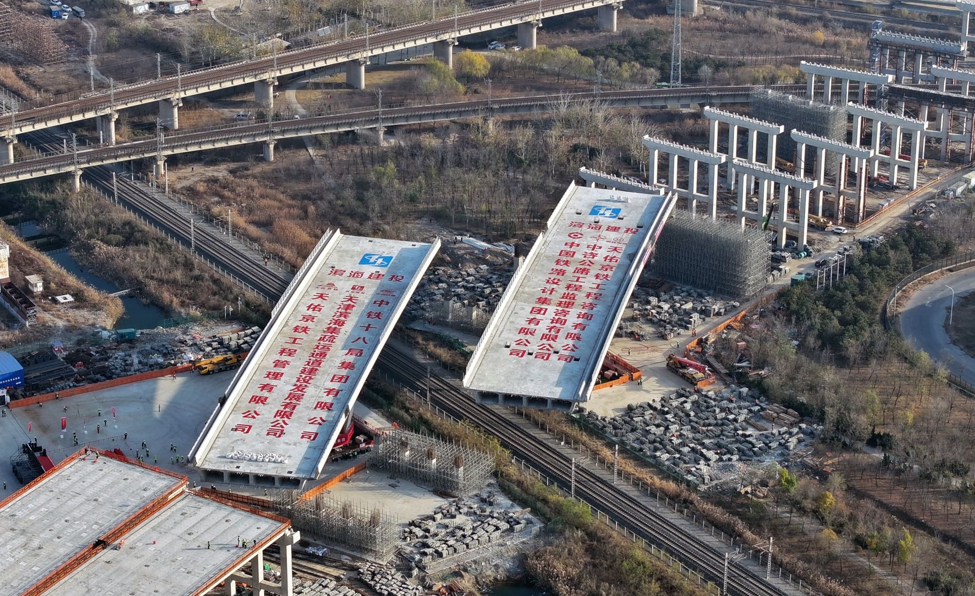 11月26日,由天津滨海建投基建管理有限公司负责建设的兴港高速上跨津山铁路转体桥工程完成转体施工。工程承建方中铁十八局仅耗时约1小时便将两座重1.4万吨的转体连续梁,同步顺时针旋转60余度实现“完美转身”。