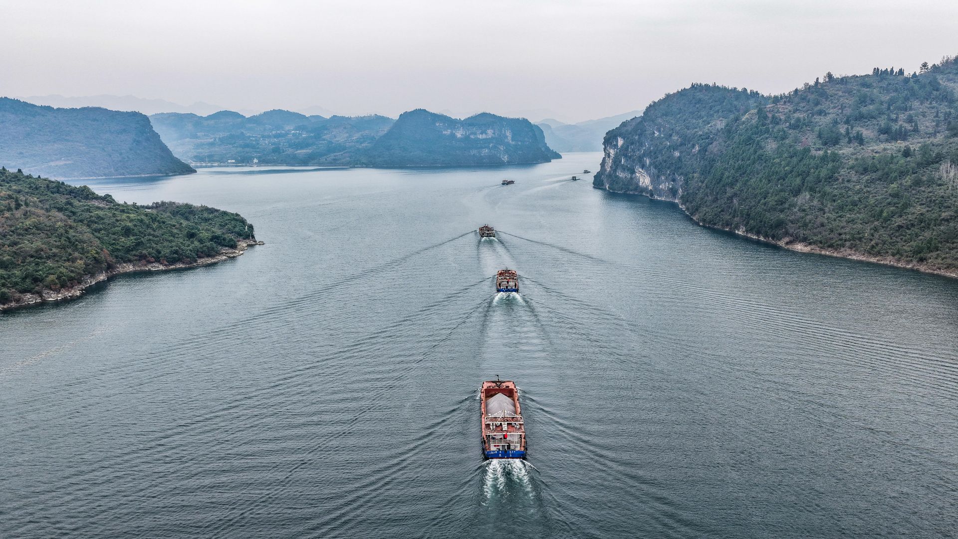 12月16日,货船从瓮安港云中港区启运出发(无人机照片)。