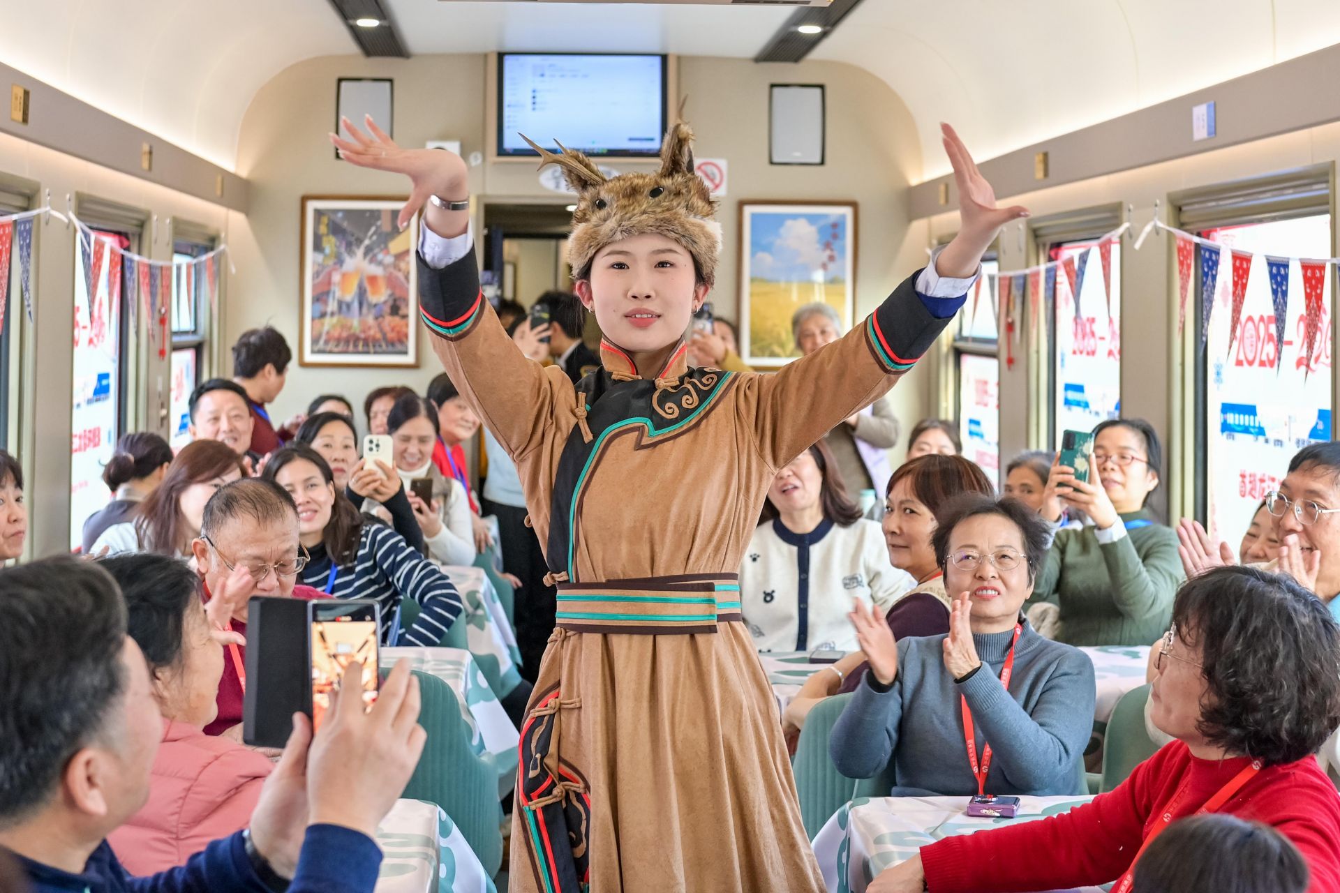 12月28日,游客在旅游列车上观看鄂伦春族民俗表演。