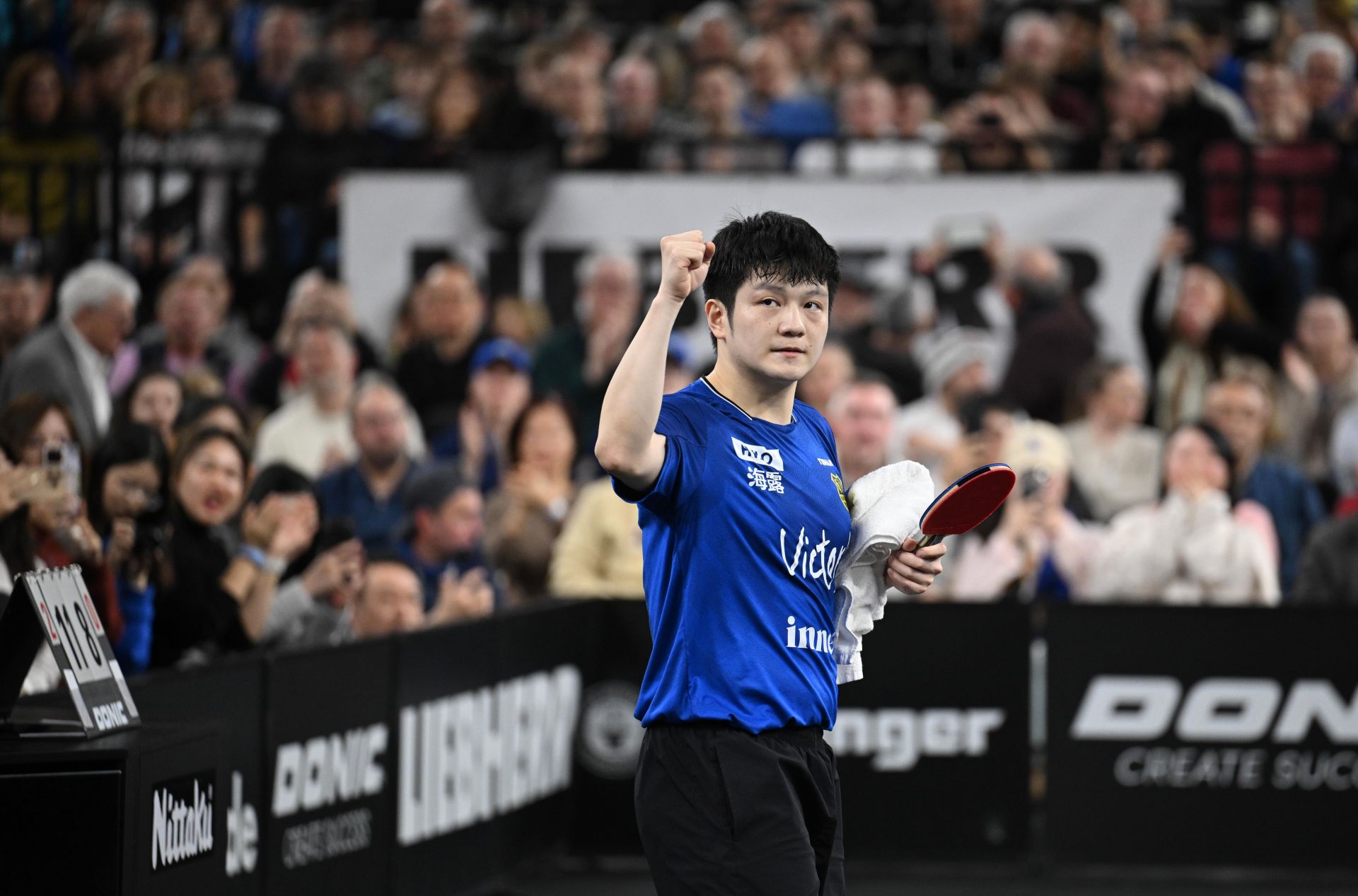 1月4日,萨尔布吕肯队球员樊振东在男子单打比赛后庆祝。最终他3比0战胜富尔达-马伯策尔队球员奥恰洛夫。