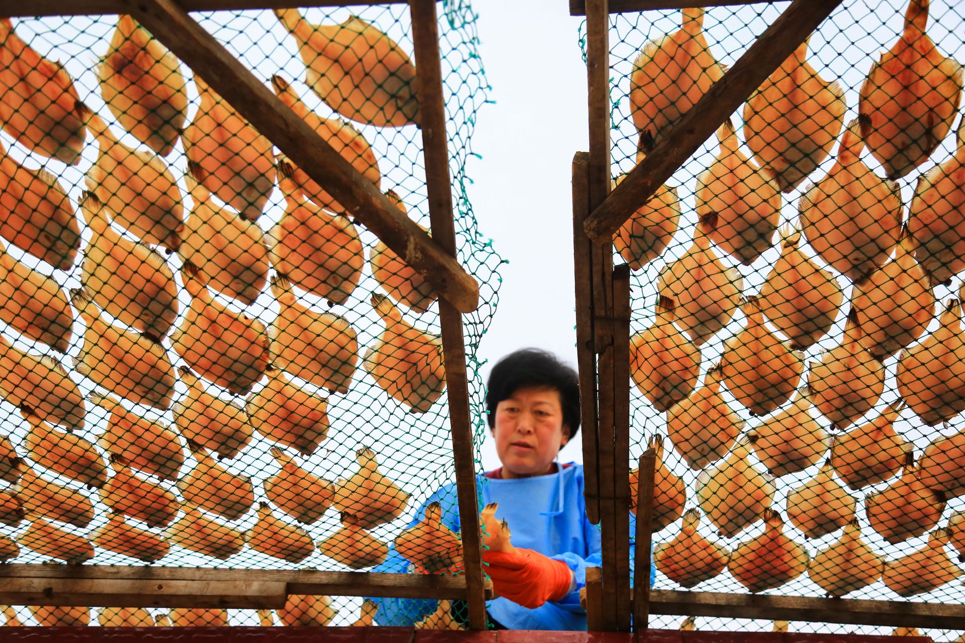 春节临近,山东省青岛市即墨区沿海一带的渔民趁着晴好天气,将捕获的海鱼经过切割、腌制、晾晒等工序加工成鱼干,供应年货市场。