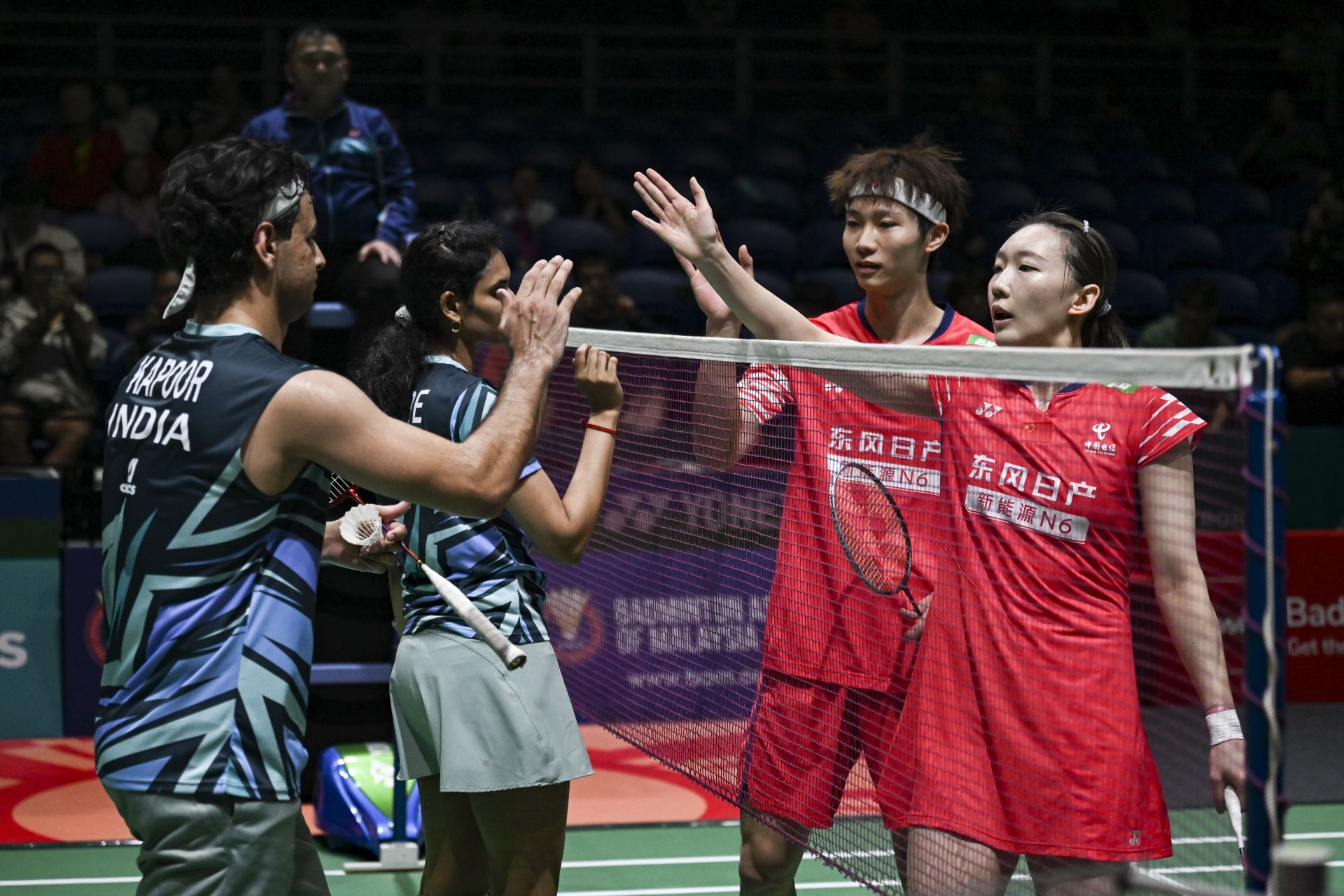 1月7日,蒋振邦(右二)/魏雅欣(右一)与对手在比赛后互相致意。