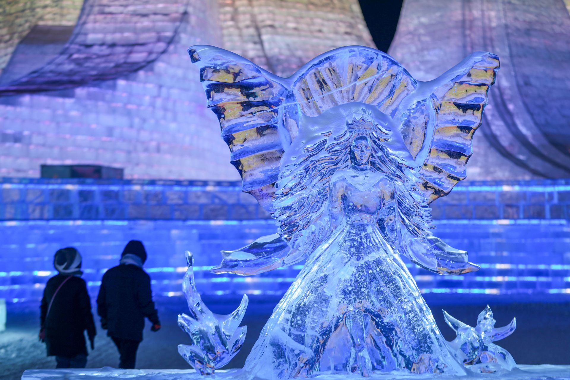 1月13日,游客从哈尔滨冰雪大世界园区内的冰雕作品《森林仙子》旁经过。
