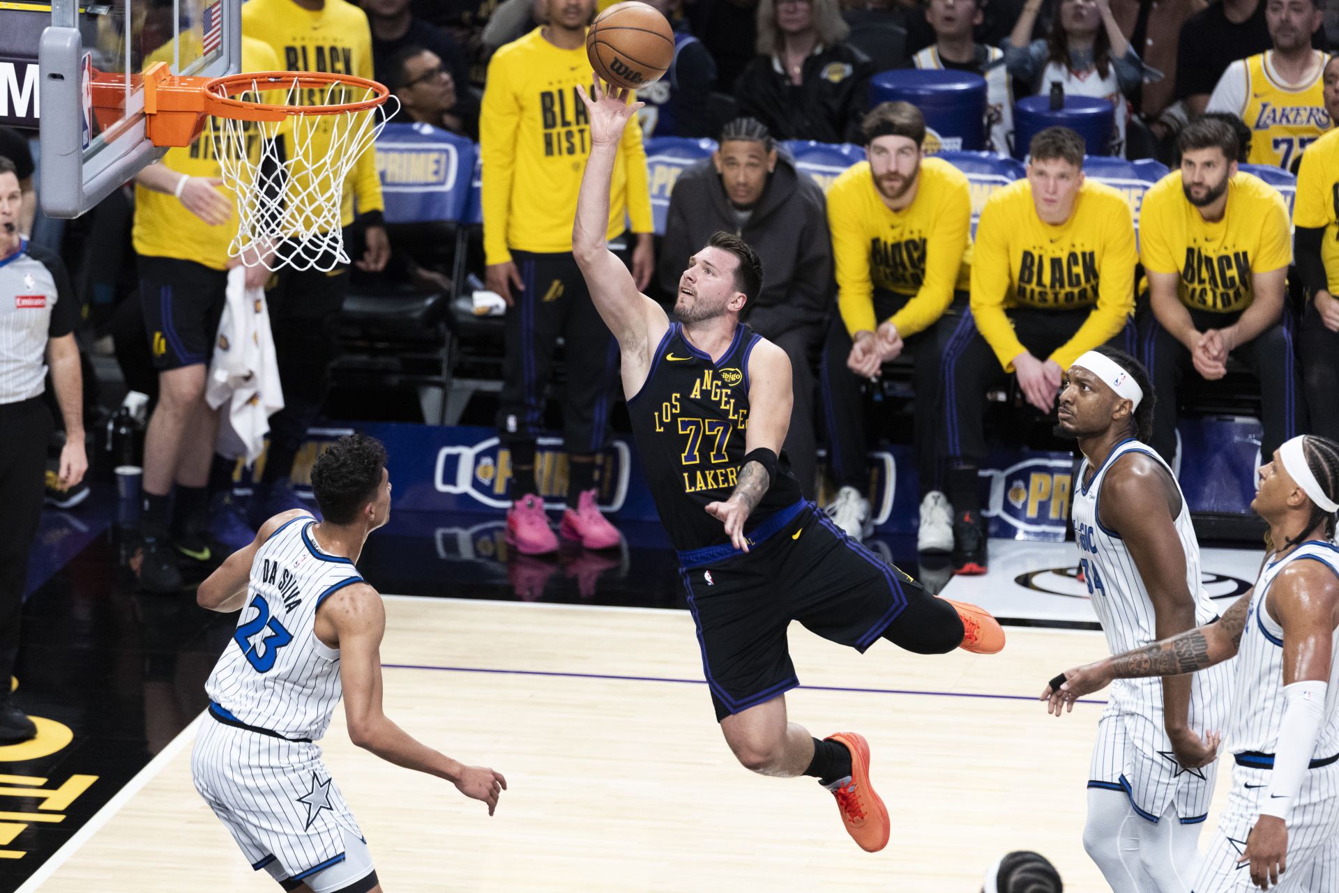 2月24日,湖人队球员卢卡·东契奇(中)在比赛中投篮。