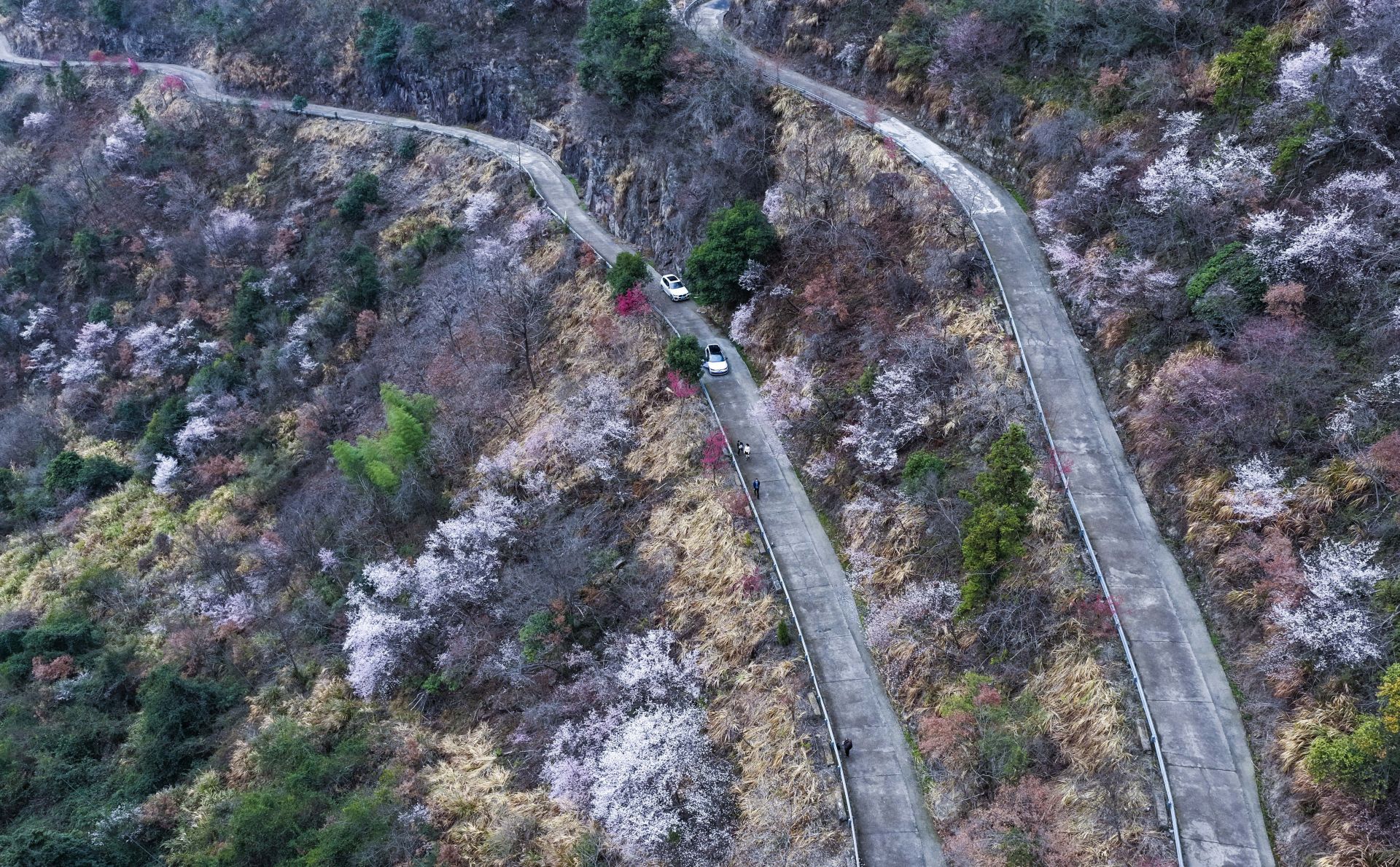 2月25日拍摄的漫山遍野盛开的野樱花(无人机照片)。
