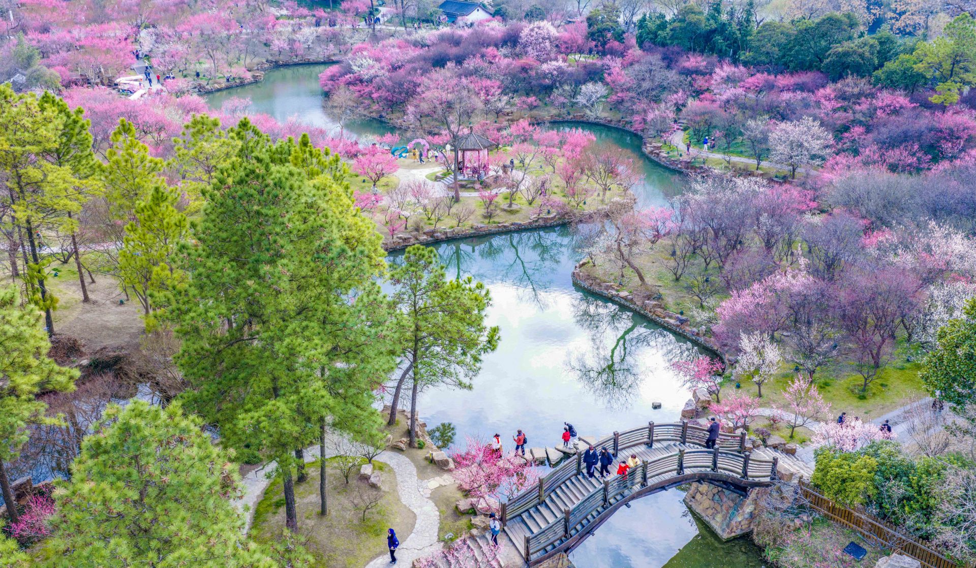 2月25日,游客在江苏扬州瘦西湖风景区赏梅游玩(无人机照片)。