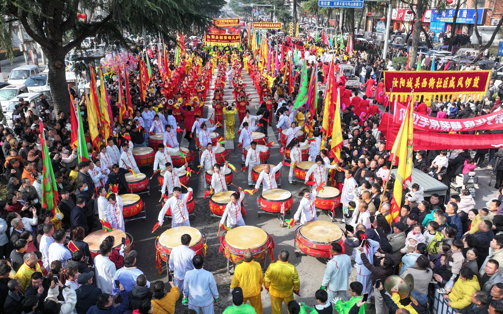 3月3日,在河南省洛阳市汝阳县杜康大道,城关镇东街社区铜乐社队员在表演打锣鼓(无人机照片)。