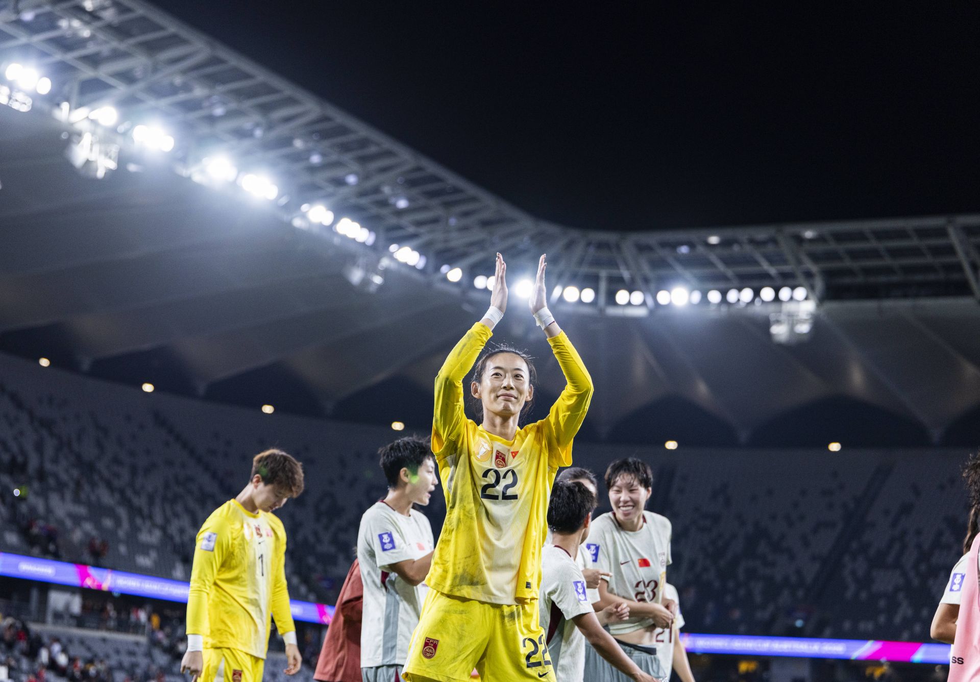 3月9日,中国队守门员陈晨(中)在赛后向观众致意。