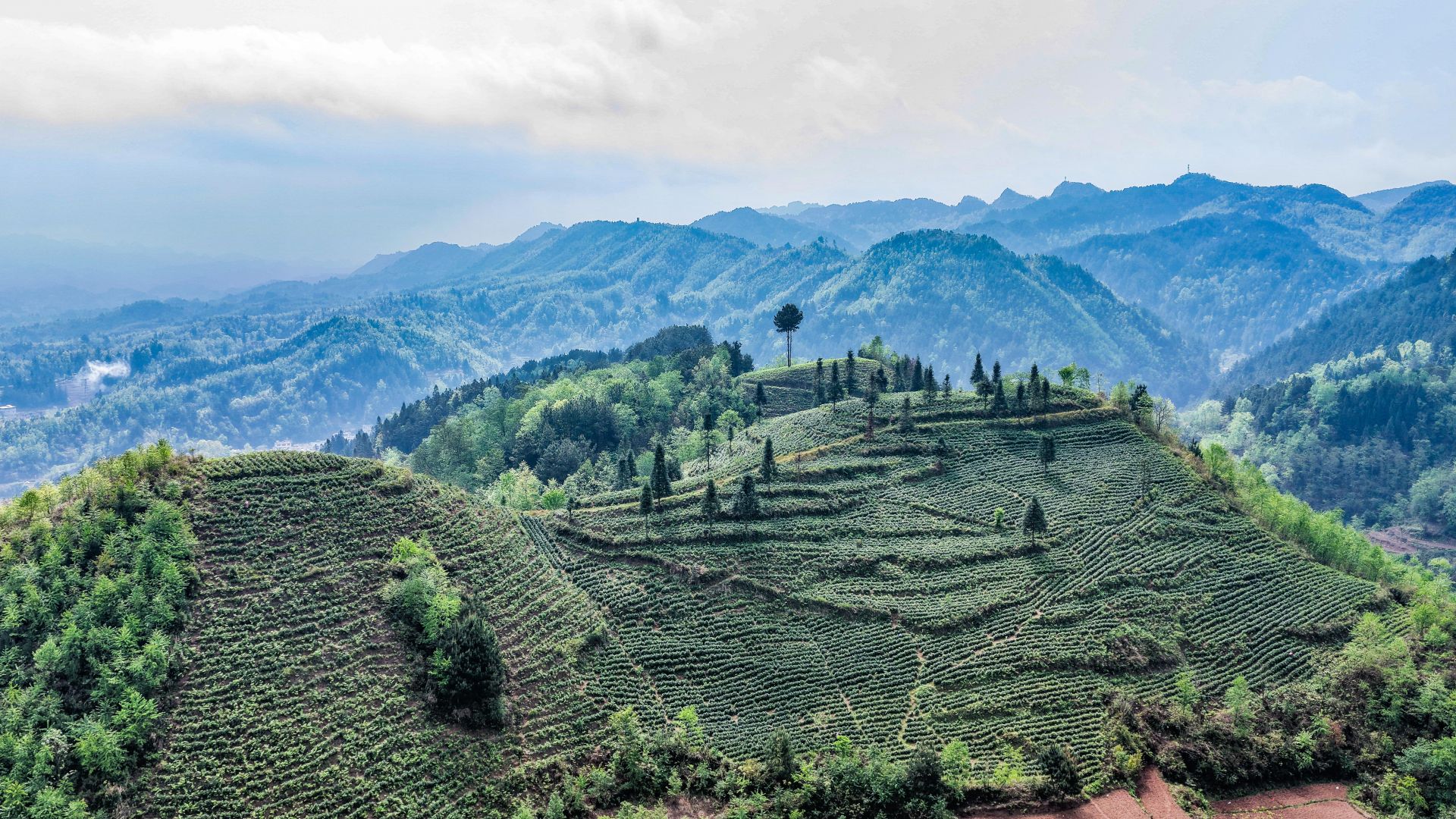 六盘水市六枝特区月亮河彝族布依族苗族乡茶山风光(无人机照片,4月2日摄)。
