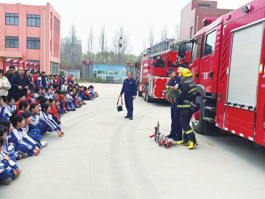 在“全国中小学生安全教育日”来临之际,禹城市消防救援局工作人员近日走进龙泽实验学校,组织学生观摩体验消防车辆装备,带领学生试穿灭火战斗服、乘坐消防车,对消防云梯车、消防服、消防水带以及各种器材进行讲解,让学生“零距离”体验消防。 尹岩摄