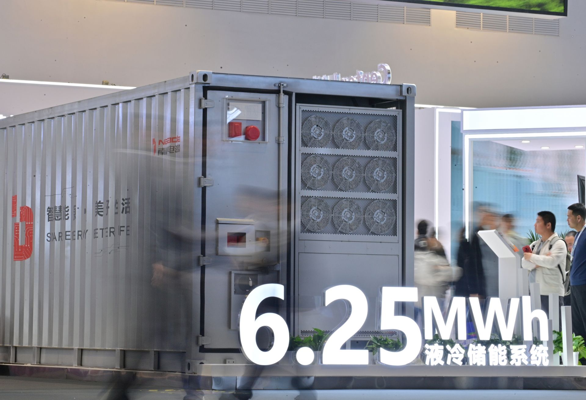 4月2日,参观者在第十四届储能国际峰会暨展览会上了解南都电源的6.25MWh液冷储能系统。