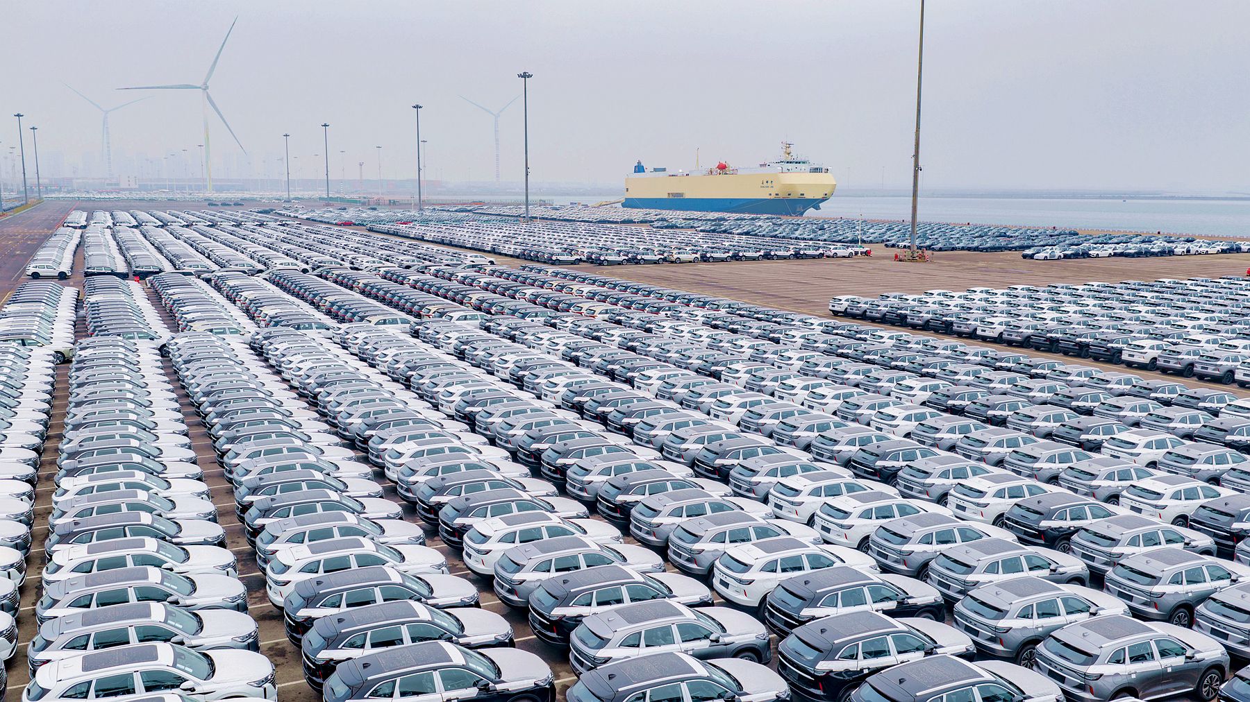 这是4月10日在天津港海嘉滚装码头拍摄的准备装船的国产汽车(无人机照片)。
