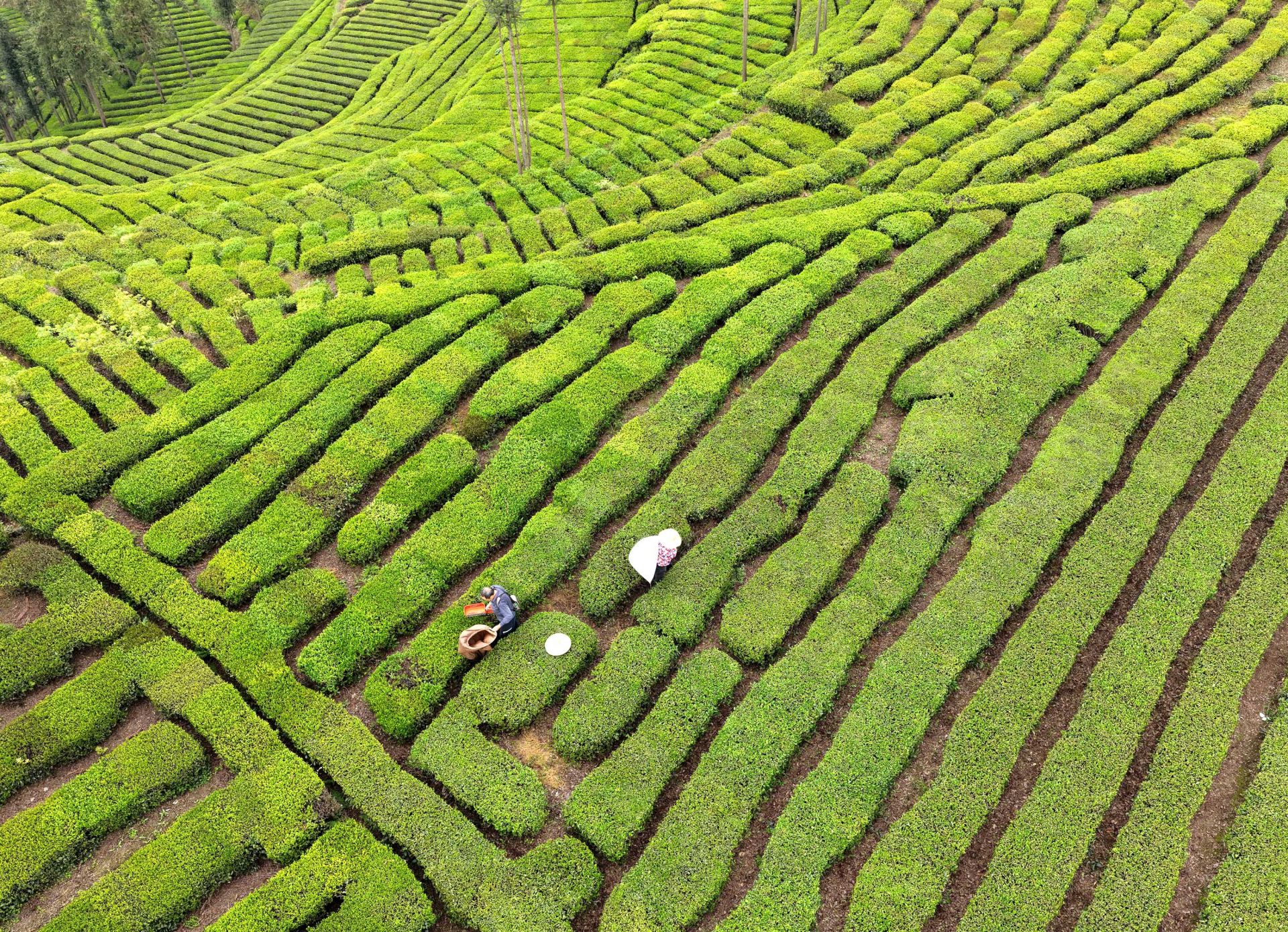 4月13日,茶农在三峡库区湖北省秭归县茅坪镇长岭村一生态茶园采摘春茶(无人机照片)。