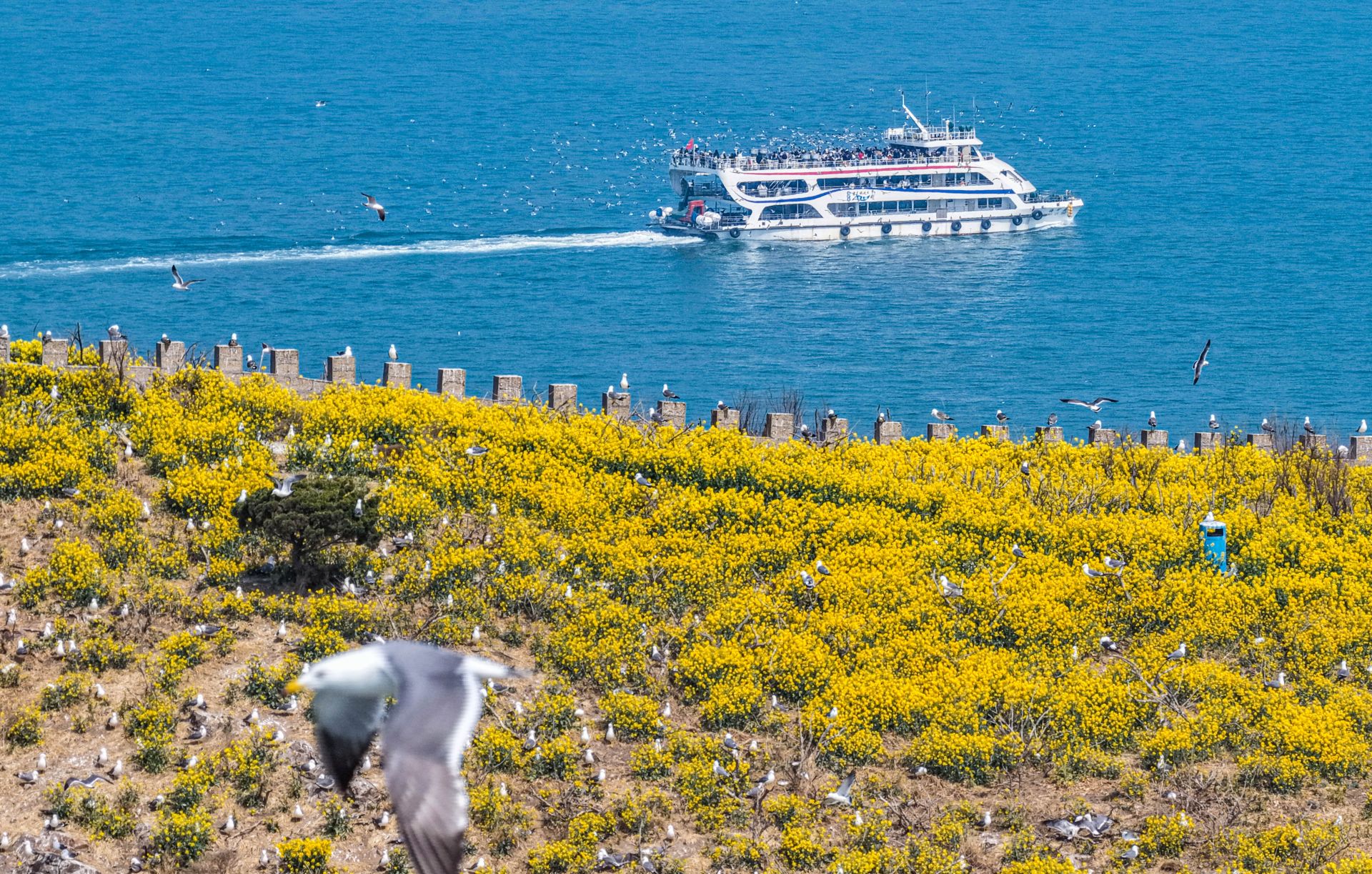 眼下,山东省荣成市海驴岛上油菜花绽放,数万只黑尾鸥在此栖息繁衍,优美的生态画卷吸引众多游客乘坐游轮前往海驴岛海域休闲游玩。